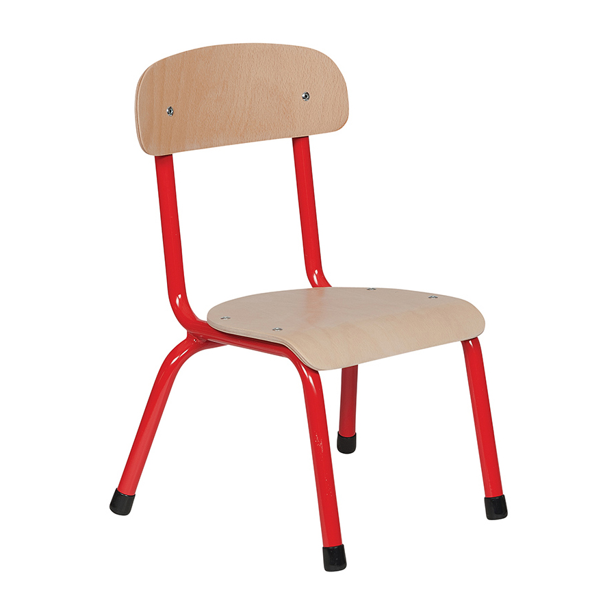 Barnstol Lotta från ABA Skol. En stabil och sittvänlig barnstol. Rygg och sits i lackerad bok på en stomme av pulverlackerade stålrör. Godkänd enligt gällande EN-standard. Stapelbar.