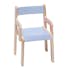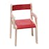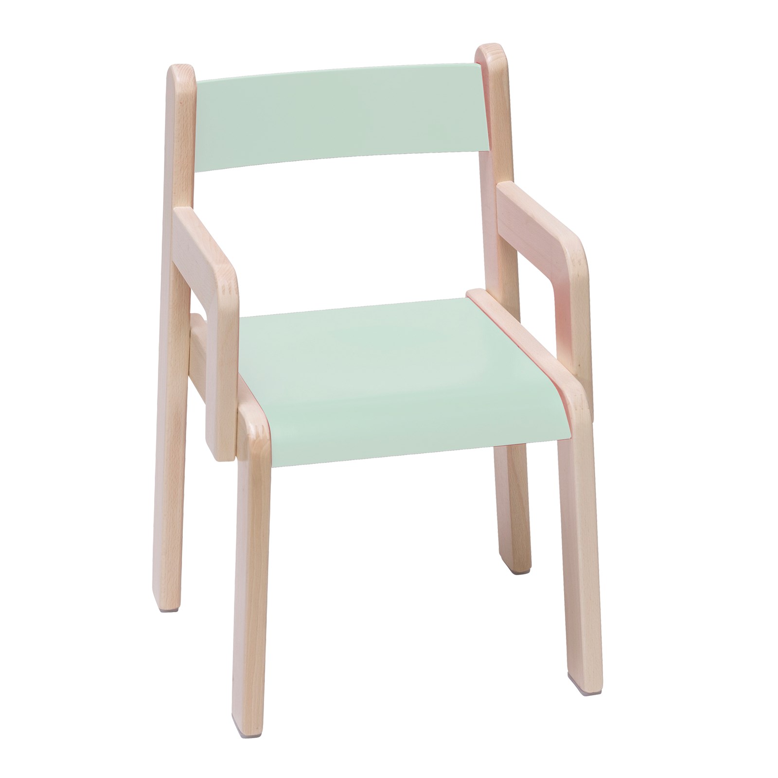Barnstol Timmi från ABA Skol. Tillverkad i massiv bok med formspänd sits och rygg med armstöd. Sitsen har rundad kant framtill. Det finns inga spikar eller skruvar i sits och rygg. Stapelbar. Plast-tass medföljer.