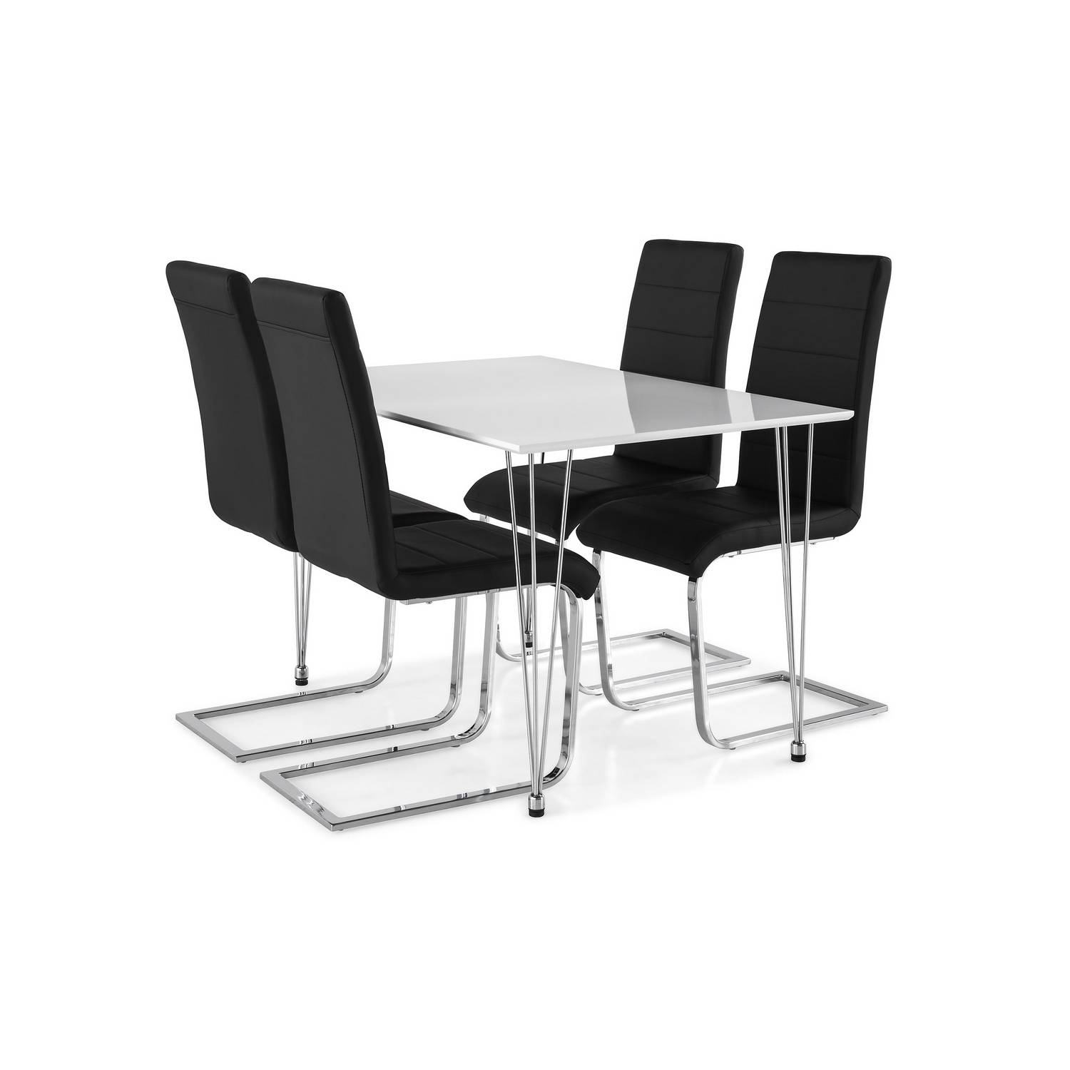 Matgrupp Kronblom med 4 Cibus-stolar. Den här matgruppen kommer garanterat inte att gå obemärkt förbi. Matbordet har en högblank vit bordsskiva och luftiga ben i kromad metall. Fyra Cibus matstolar fulländar den stilfulla looken. Den här matgruppen är en perfekt plats att spendera tid med familj och vänner.