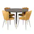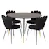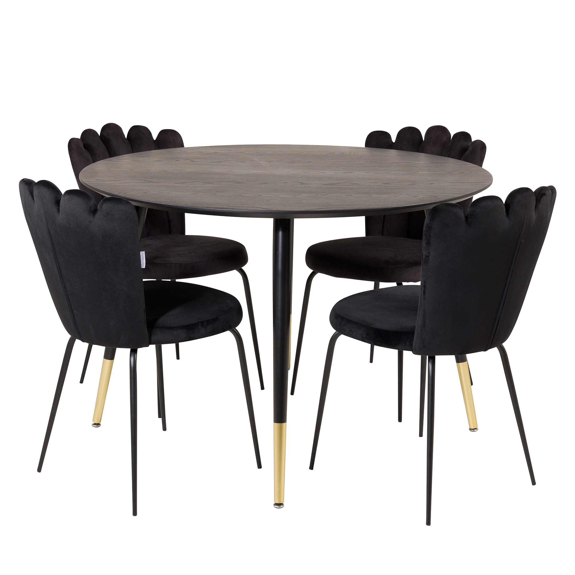 Matgrupp från Furniture Fashion. Runt matbord Disa med stomme och ben i svart metall samt benslut i mässing. Bordsskiva av MDF i svart faner. Matstolar Limhamn Light med stomme och ben i svart metall. Hög rygg i en exklusivt utformad design. Ryggen och sitsen är i sammet. Lättare montering krävs.