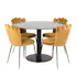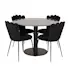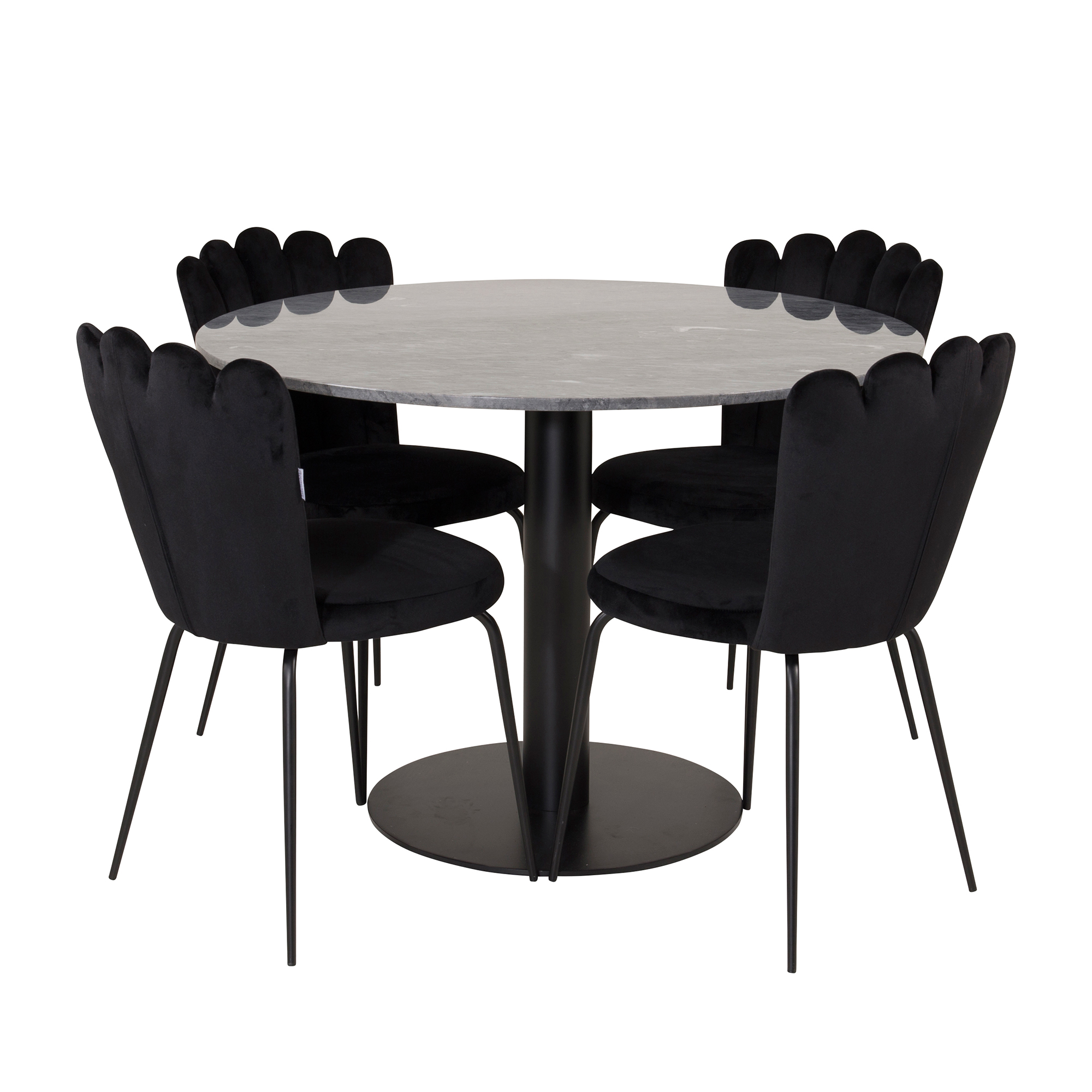 Matgrupp från Furniture Fashion. Runt matbord Ester med fot och rund centrumpelare i metall. Bordsskiva i svart marmor. Matstolar Limhamn Light med stomme och ben i svart metall. Hög rygg i en exklusivt utformad design. Ryggen och sitsen är i sammet. Lättare montering krävs.