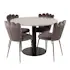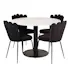 Matgrupp från Furniture Fashion. Runt matbord Roxanna med en rund fot och centrumpelare i svart metall. Bordsskiva i Terazzo. Matstolar Limhamn Light med stomme och ben i svart metall. Hög rygg i en exklusivt utformad design. Ryggen och sitsen är i sammet. Lättare montering krävs.