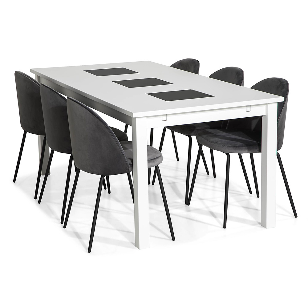 Matgrupp In Living Jasmin Förlängningsbart 180 med 6 Felipe Stol Sammet är en elegant matgrupp med ett vitt bord med snygga detaljer och sex sammetsstolar.