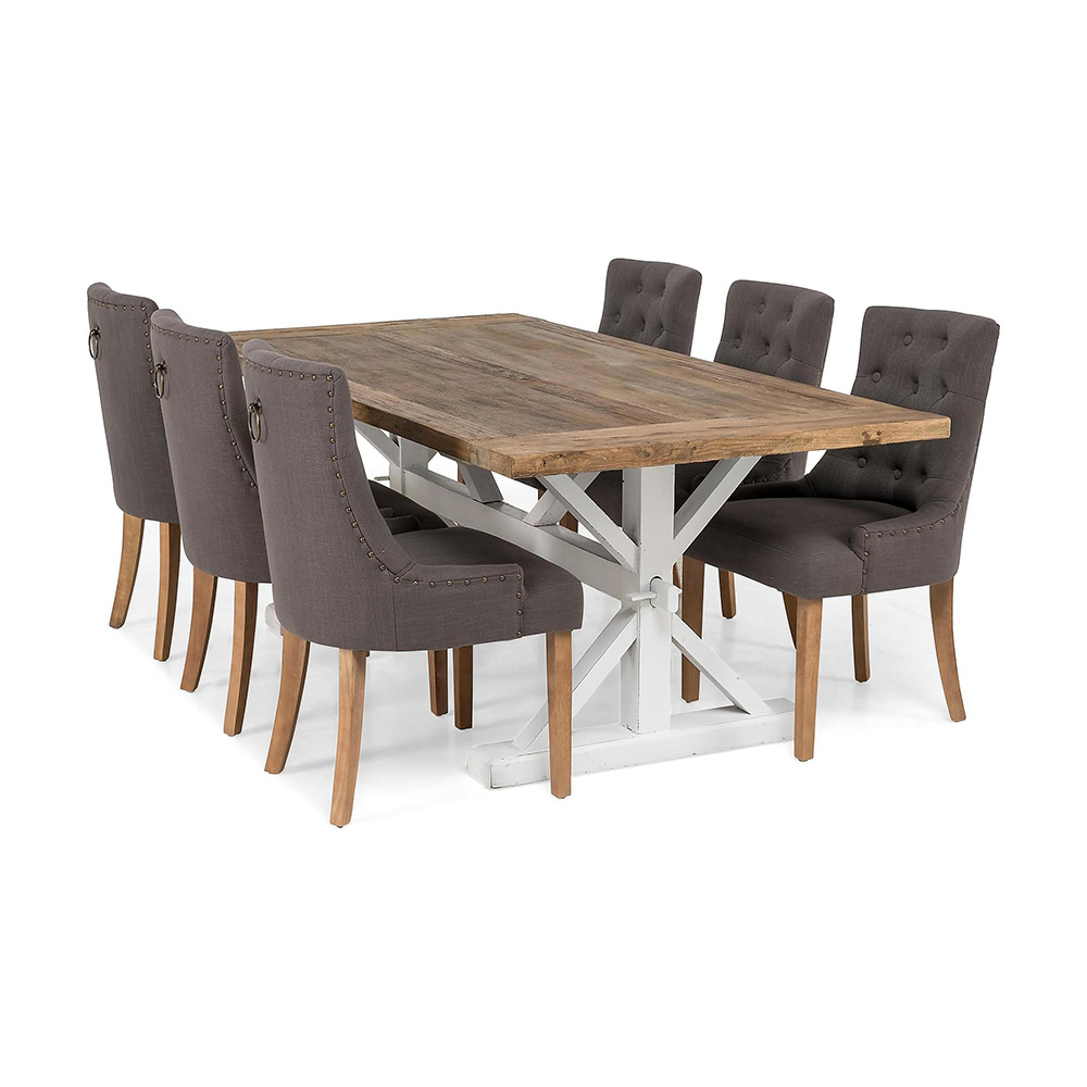 Matgrupp In Living Lyon Natur/Vit 200x100 cm med 6 st Viktoria Stolar är en rustik matgrupp med massor av charm. Matbordet är rejält med bordsskiva i vintage almträ och vitt underrede i klassisk stil. Bordet har mindre märken som tillför charm till möbeln och ger matbordet en naturlig look med genuin känsla. Fåtöljen Viktoria fångar blicken direkt med en iögonfallande design och exklusiva detaljer. Klassiskt knappklädd rygg, pärlspik, ringbeslag på baksidan, vinklade ben och vacker linneklädsel är karaktärsdrag för Viktoria. Den utmärkta sittkomforten bjuder in till långa och trevliga middagar.