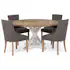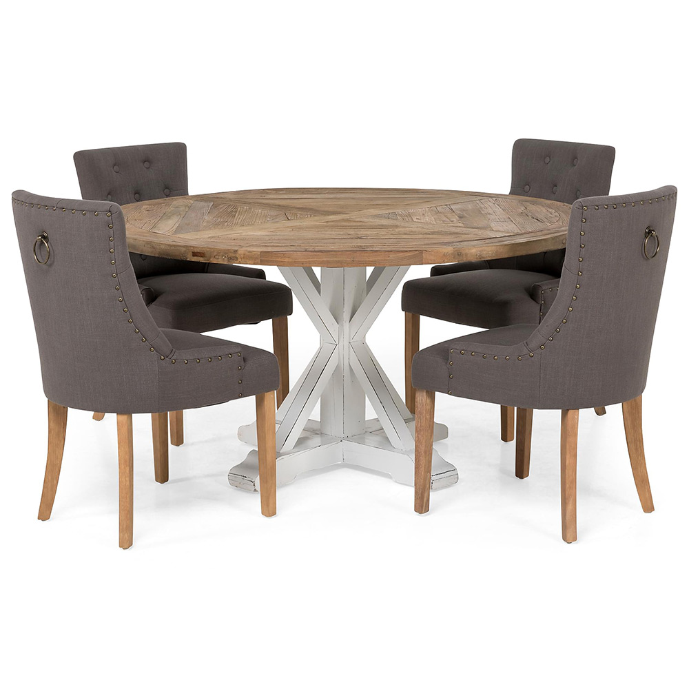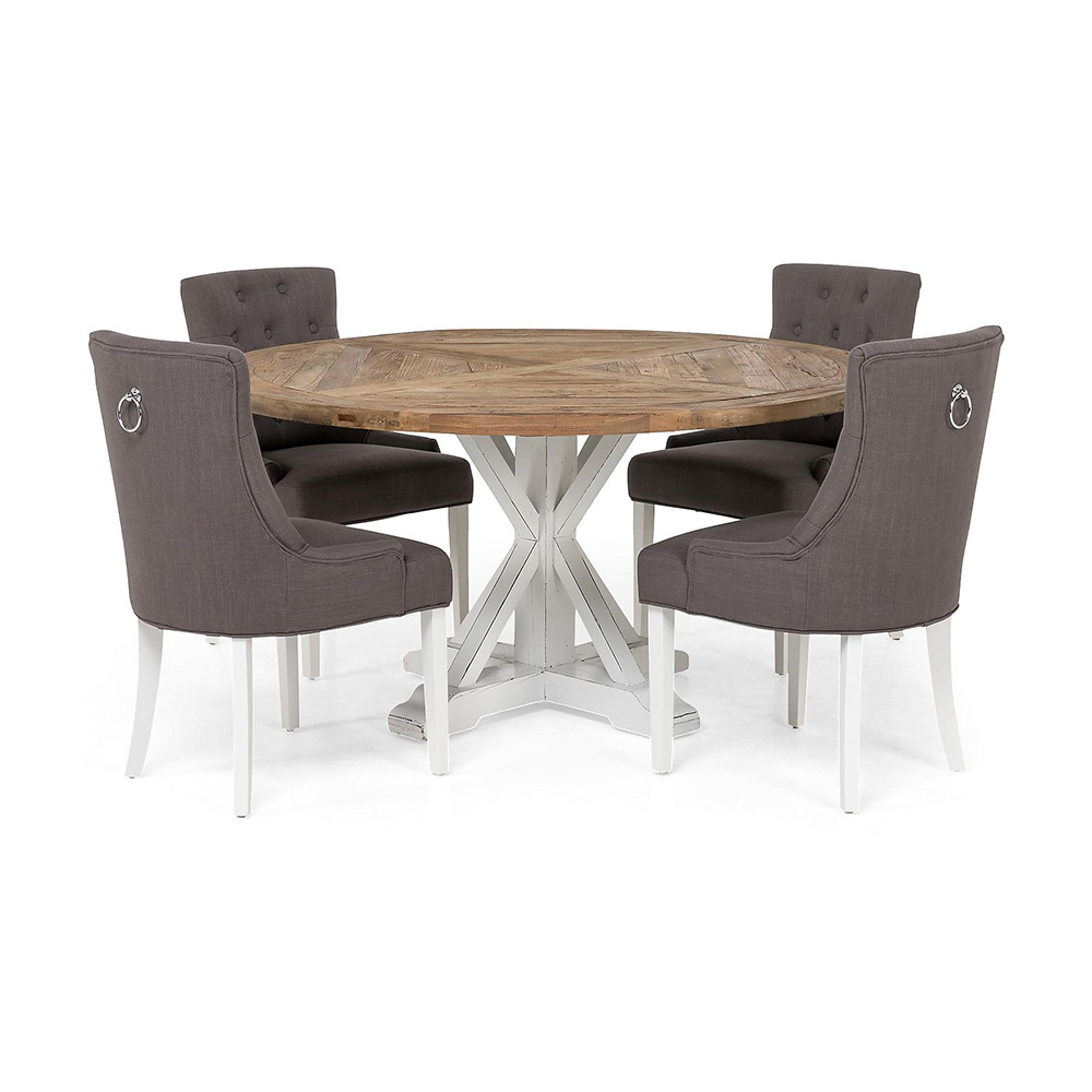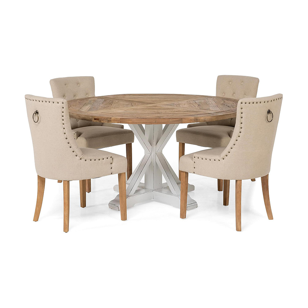 Matgrupp In Living Lyon Ø150 cm Rund Natur/Vit med 4 st Viktoria Stolar är en elegant matgrupp med ett rustikt, runt bord samt fyra bekväma stolar.
