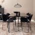 Matgrupp Annika från Venture Home. Med ett matbord i svart MDF med faner med svarta bordsben i järn. Matchas med 6 st Valor matstolar med svarta stolsben i metall och svarta sitsar i polyester.