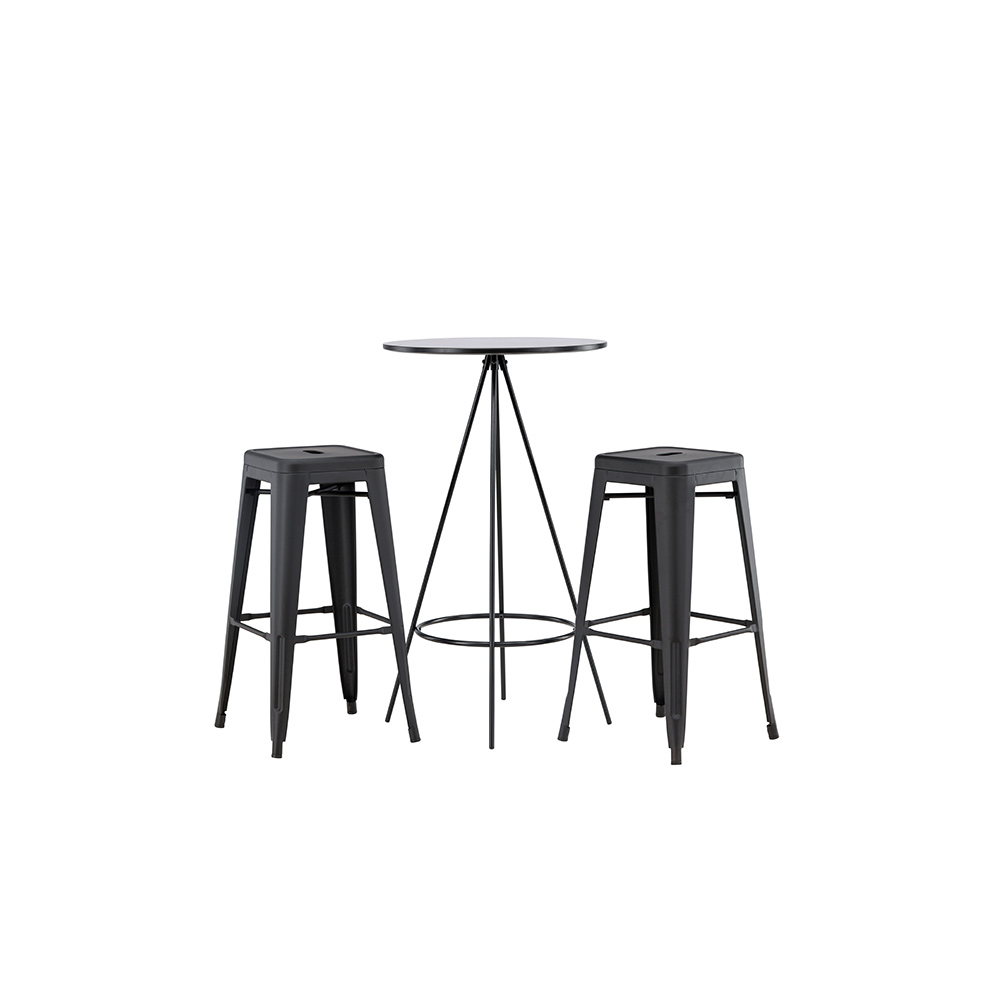 Höj stilnivån i ditt hem! Barbordet Bistro har en minimalistisk, Skandinavisk design med en rund bordsskiva i MDF med faner. De luftiga, konformade bordsbenen är lätt utsvängda i metall och har en integrerad ram till fotstöd. Här i perfekt kombination med barstolar från serien Tempe. Stolen har en klassisk design av en högre pall med lätt utsvängda ben och sits i stål och en ram för fotstöd. Den här bargruppen passar perfekt för det lilla köket!