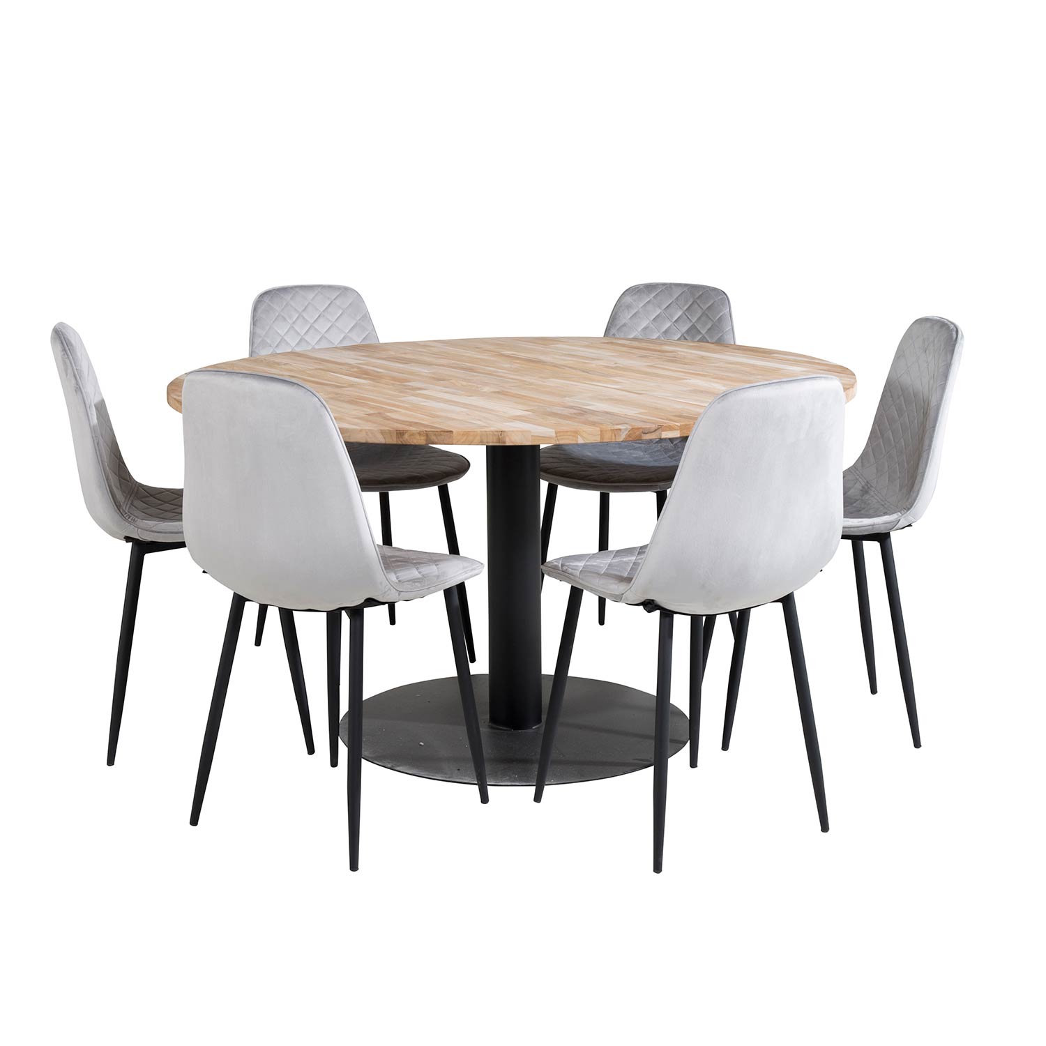 Matgrupp Venture Home Cirebon Rund med 6 Polar Stolar är en trendig matgrupp med ett runt Cirebon-matbord med en bordsskiva i teak och ett underrede i metall samt sex matstolar i en helklädd design med ben i svart pulverlackerad metall. Lätt rundad rygg och sits i stoppat grått sammetstyg med dekorsömmar på insidan av rygg och sits som bildar ett rutmönster. Lättare montering krävs.