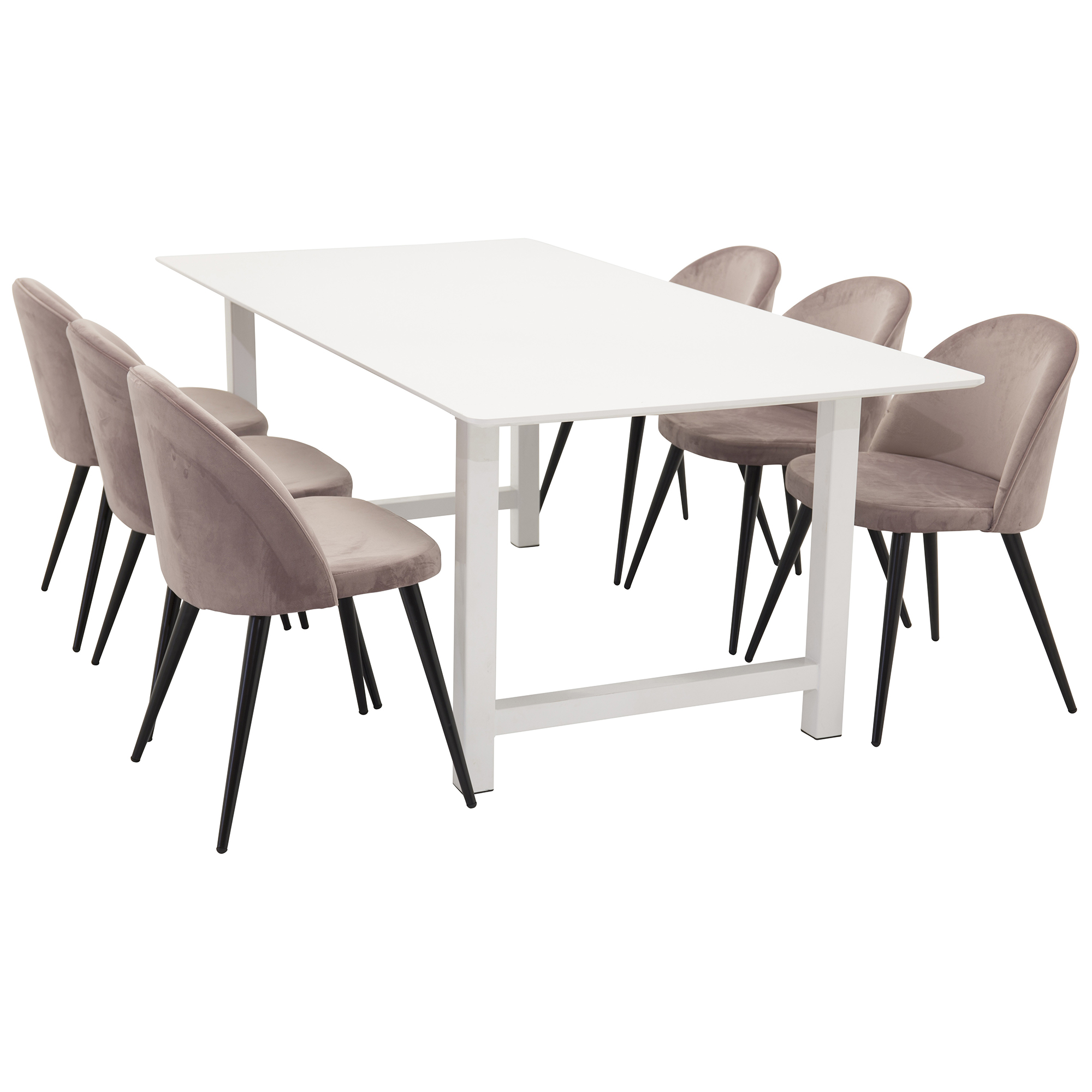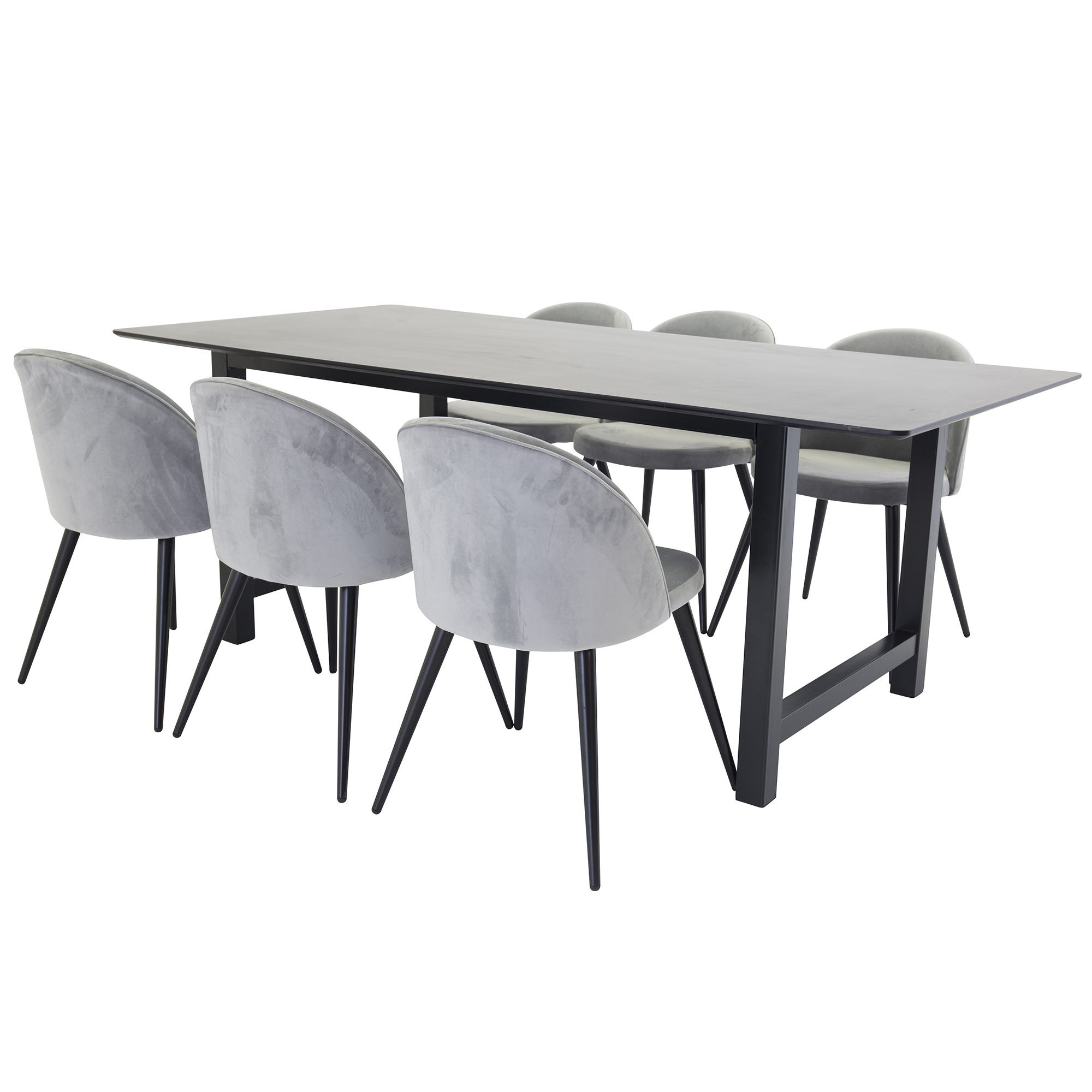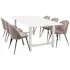 Matgrupp Clara från Venture Home. Matbord i MDF med svarta bordsben i metall. Matchas med 6 st Valentina matstolar med stolsits i sammet och svarta stolsben i metall.