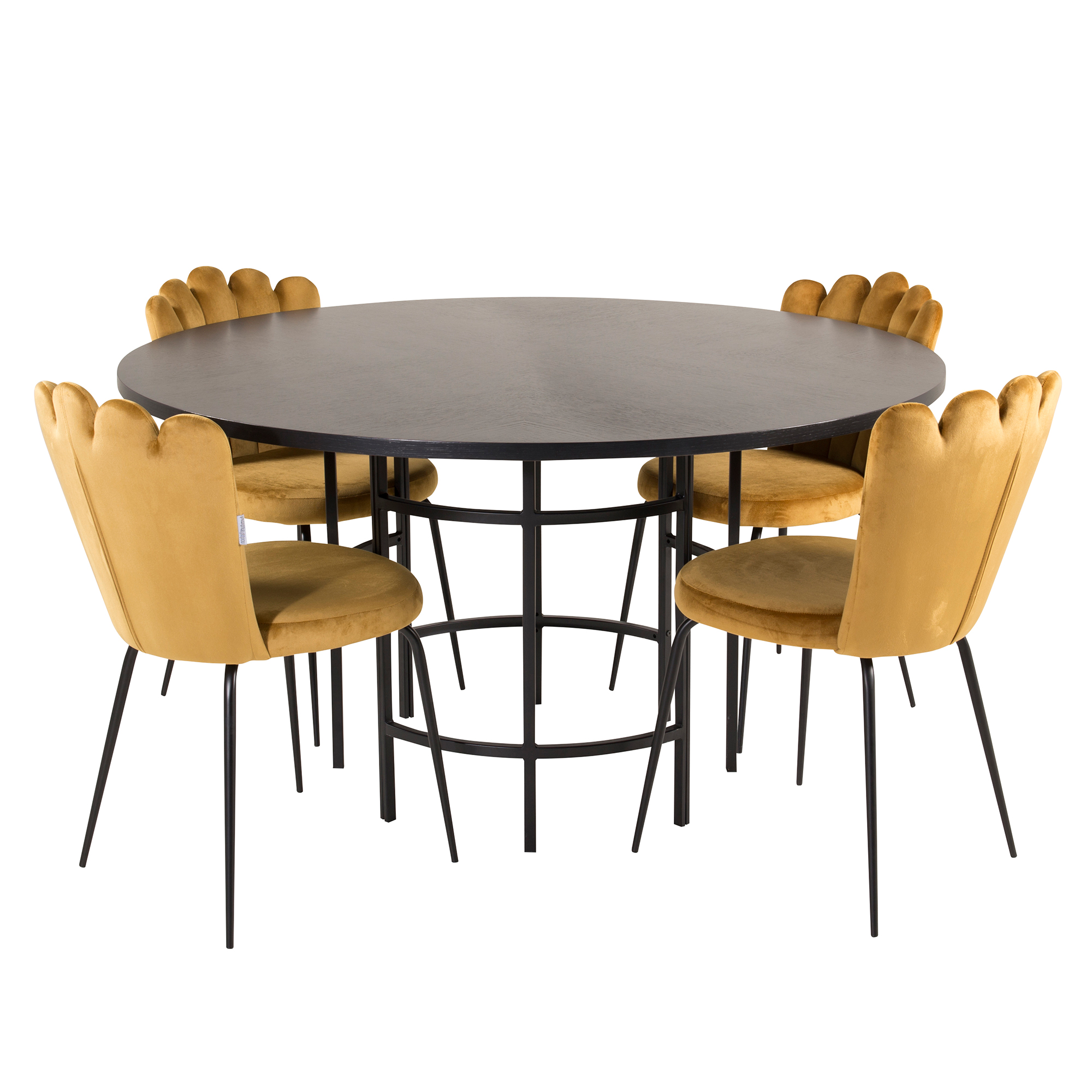 Matgrupp från Furniture Fashion. Runt matbord Copenhagen med en snygg designad metallstomme och ben som följer bordets form. Bordsskiva av MDF. Matstolar Limhamn Light med stomme och ben i svart metall. Ryggen i en exklusivt utformad design. Ryggen och sitsen är i guldfärgad sammet. Lättare montering krävs.