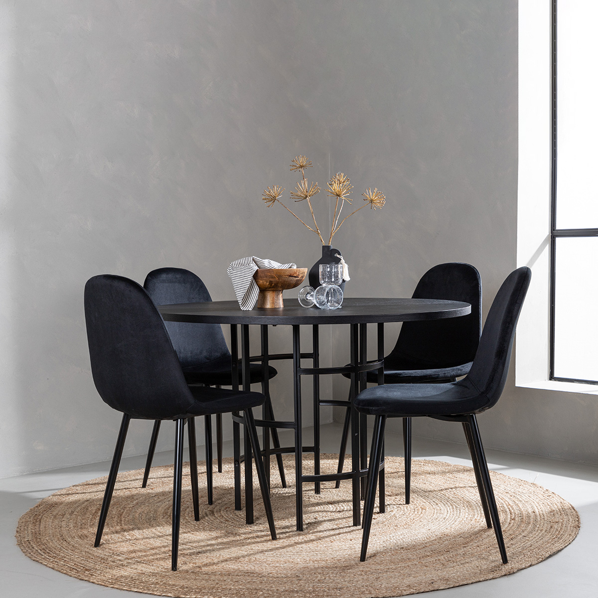 Matgrupp Venture Home Copenhagen med 4 Polar stolar. Stilrent, modernt och tidlöst - en matgrupp som imponerar! Bordets cylinderformade ben är gjorda i metall och den runda toppskivan i MDF med fanér. Stolen har en helklädd design med en rundad rygg och sits i sammetstyg med mjuk stoppning och ben i pulverlackerad metall.