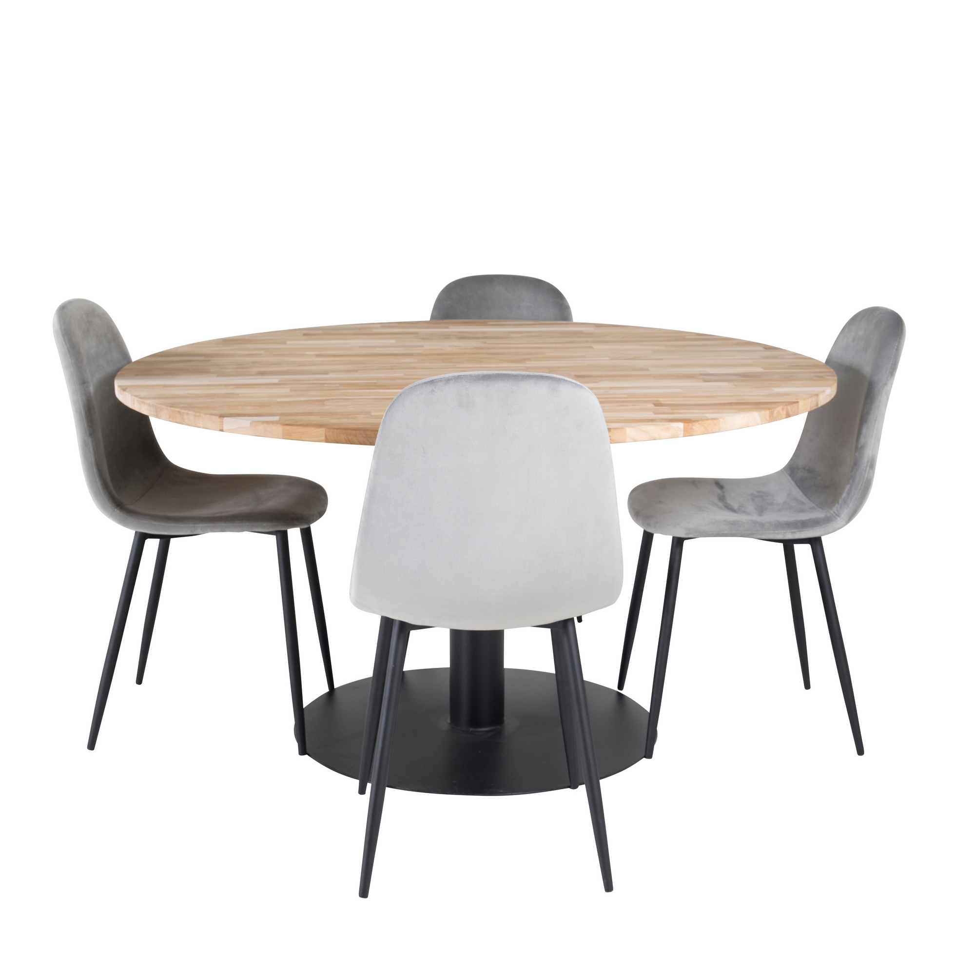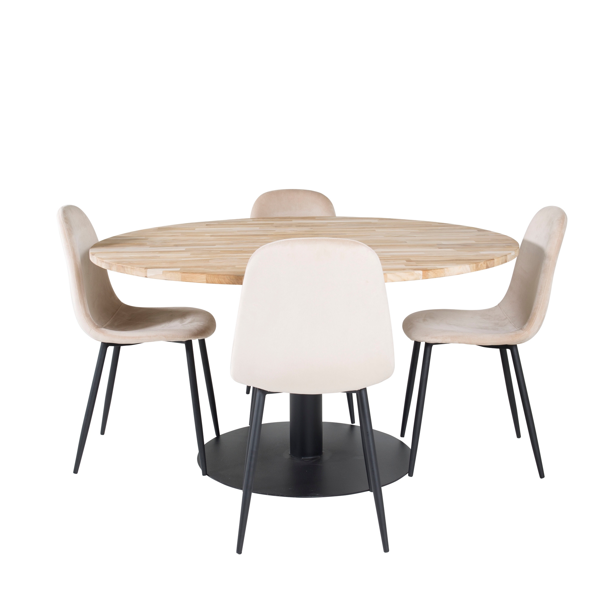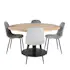 Matgrupp Venture Home Cornelia med 4 Pobbie Stolar är en modern matgrupp med ett runt Cornelia-matbord med en bordsskiva i teak och ett svart underrede i metall samt fyra Pobbie-matstolar i tyg/PU med stolsben i metall.