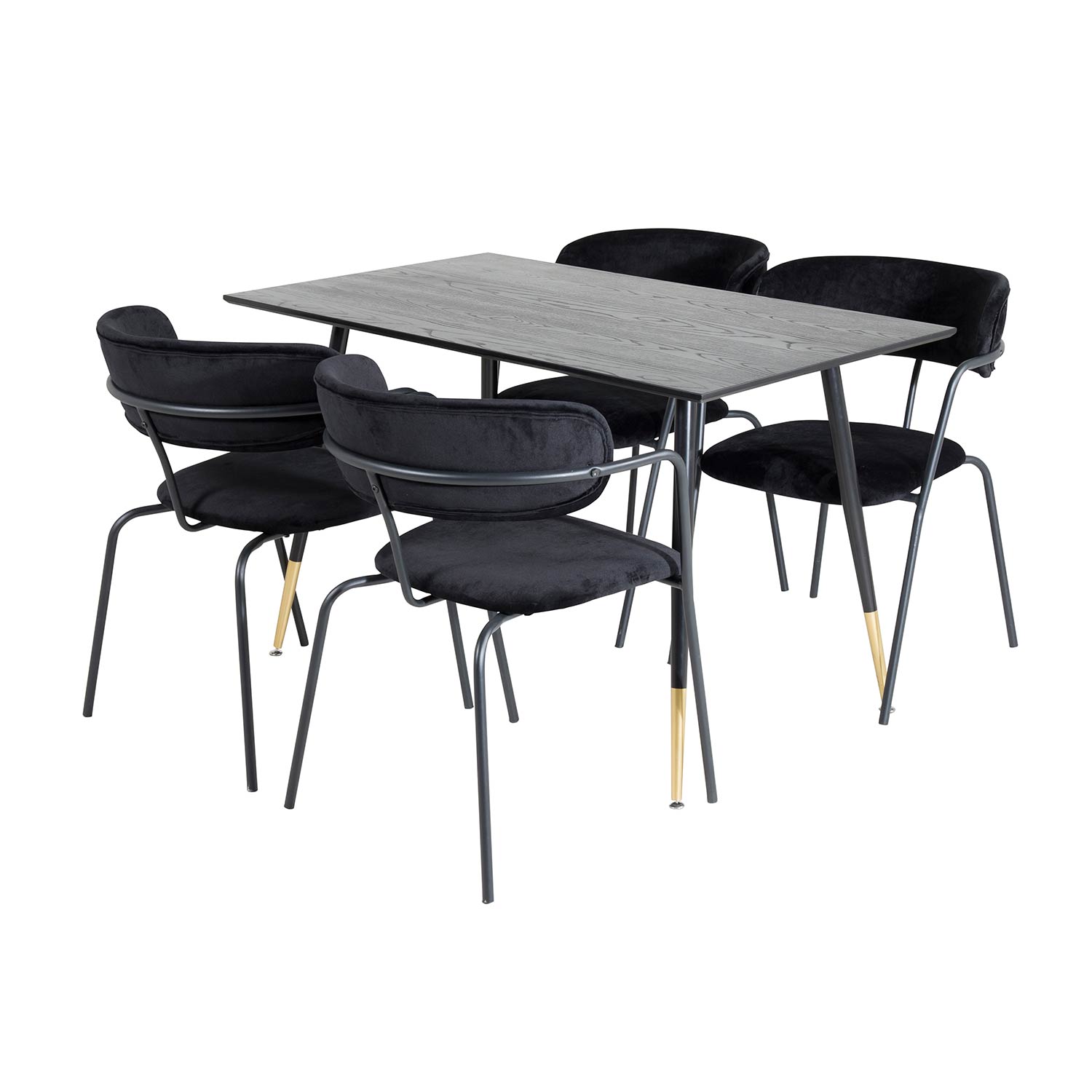 Matgrupp Venture Home Dipp med 4 Arrow Stolar är en modern matgrupp med ett rektangulärt matbord med en stomme och ben i svart pulverlackerad metall med benslut i mässingsfoliering samt med en bordsskiva i svart fanér med en kärna i MDF. Det medföljer fyra karmstolar med stomme, ben samt integrerade armstöd i metall. Rundad rygg och sits i stoppat sammetstyg. Lättare montering krävs.