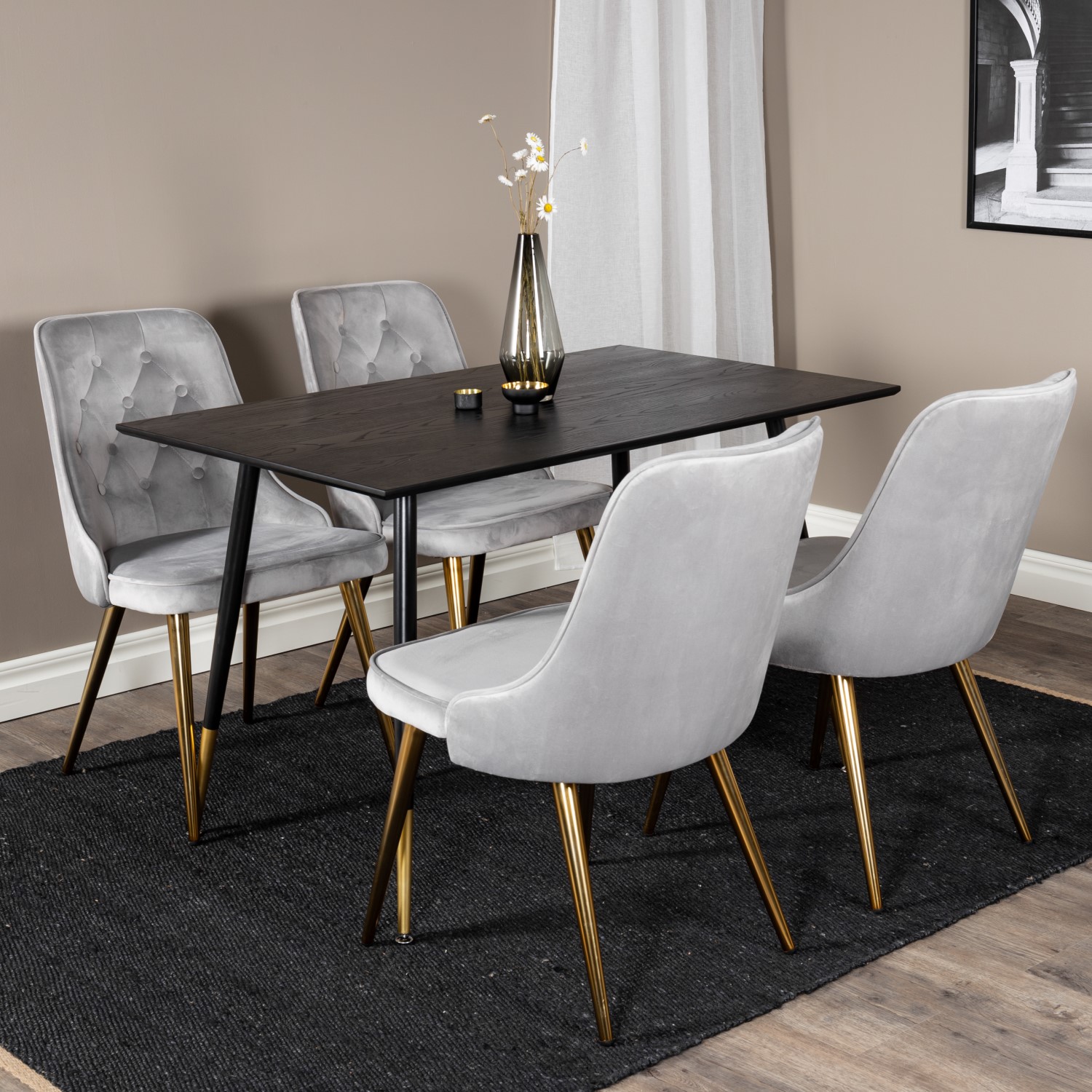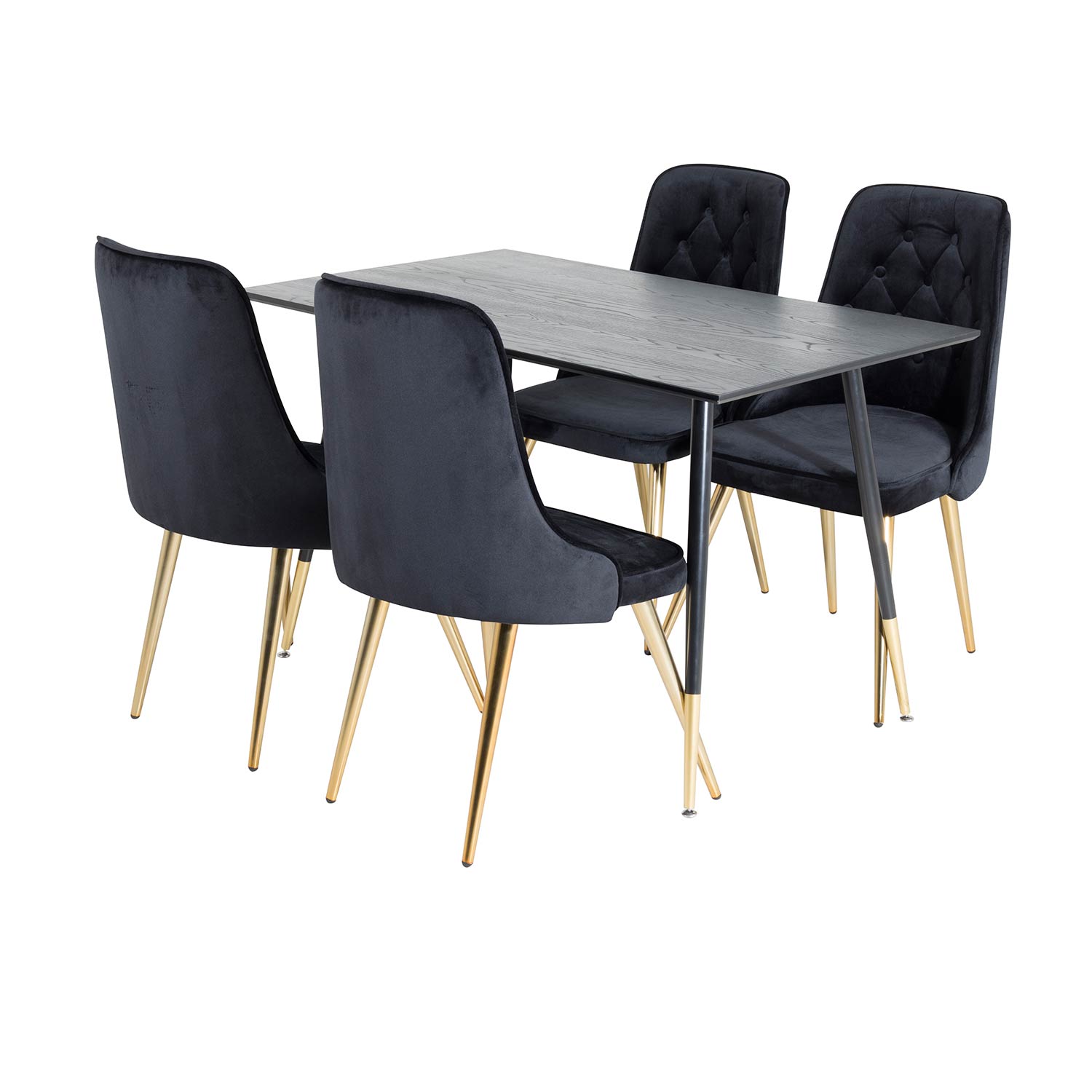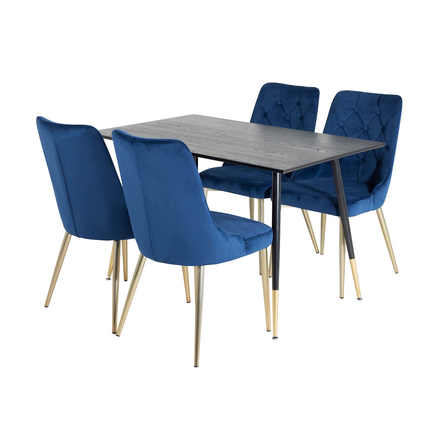 Matgrupp Venture Home Dipp med 4 Velvet Stolar är en modern matgrupp med ett rektangulärt matbord med en stomme och ben i svart pulverlackerad metall med benslut i mässingsfoliering samt med en bordsskiva i svart fanér med en kärna i MDF. Det medföljer fyra matstolar i helklädd design med ben i mässingsfolierad metall. Rygg med knappar och dekorsöm samt rygg och sits i sammetstyg med mjuk stoppning. Lättare montering krävs.