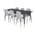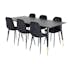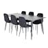 Matgrupp Venture Home Dipp med 6 Polar Stolar Sammet är en modern matgrupp med ett rektangulärt matbord med en stomme och ben i svart pulverlackerad metall samt med en bordsskiva i svart fanér med en kärna i MDF. Det medföljer sex matstolar i en helklädd design med ben i svart pulverlackerad metall. Lätt rundad rygg och sits i stoppat polyestertyg med dekorsömmar på insidan av rygg och sits som bildar ett rutmönster. Lättare montering krävs.