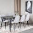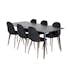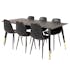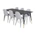 Matgrupp Venture Home DIpp med 6 Polar Stolar Polyestertyg är en modern matgrupp med ett rektangulärt matbord med en stomme och ben i svart pulverlackerad metall samt med en bordsskiva i svart fanér med en kärna i MDF. Det medföljer sex matstolar i en helklädd design med ben i svart pulverlackerad metall med en lätt rundad rygg och sits i polyestertyg. Lättare montering krävs.