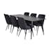 Matgrupp Venture Home Dipp med 6 Velvet Stolar Polyestertyg är en modern matgrupp med ett rektangulärt matbord med en stomme och ben i svart pulverlackerad metall samt med en bordsskiva i svart fanér med en kärna i MDF. Det medföljer sex matstolar i helklädd design med ben i svart pulverlackerad metall. Rygg med knappar och dekorsöm samt rygg och sits i polyestertyg med mjuk stoppning. Lättare montering krävs.