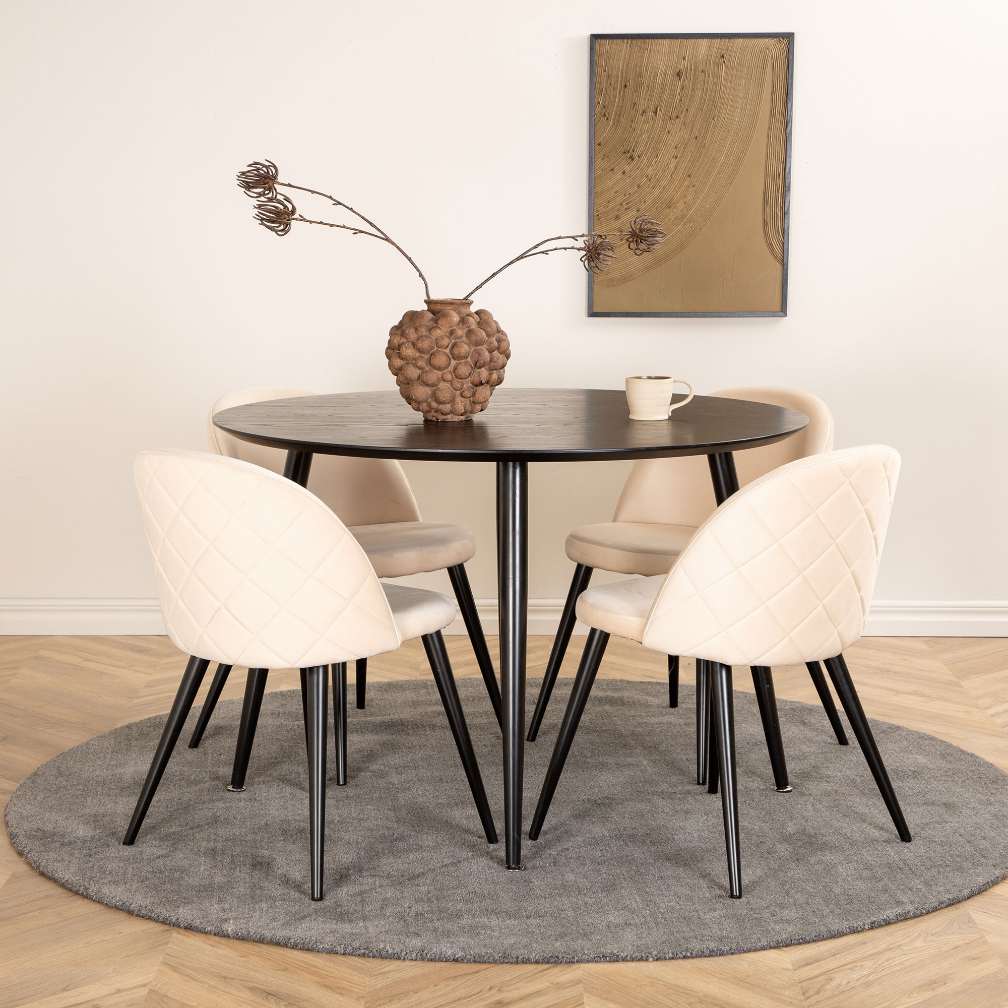 Matgrupp Dipp, med ett runt matbord i MDF med bordsben i metall. Matchas med 4 st Velvet Stitcthes matstolar med dekorsöm.
