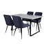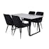 Matgrupp Venture Home Estelle 140 med 4 Plake Stolar är en modern matgrupp med ett rektangulärt matbord i modern design med underrede i svart pulverlackerad metall med en bordsskiva i marmor. Det medföljer fyra fåtöljer/matstolar i en helklädd design med ben i svart pulverlackerad metall. Rygg och sits i polyEstelletyg med mjuk stoppning. Lättare montering krävs.