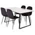 Matgrupp Venture Home Estelle 140 med 4 Pobbie Stolar Sammet är en modern matgrupp med ett rektangulärt bord och fyra bekväma stolar. Matbordet har en stomme och ben i svart metall med en bordsskiva i vit marmor. Matstolarna har stomme och ben i metall med en rundad rygg och sits i sammet. Lättare montering krävs.