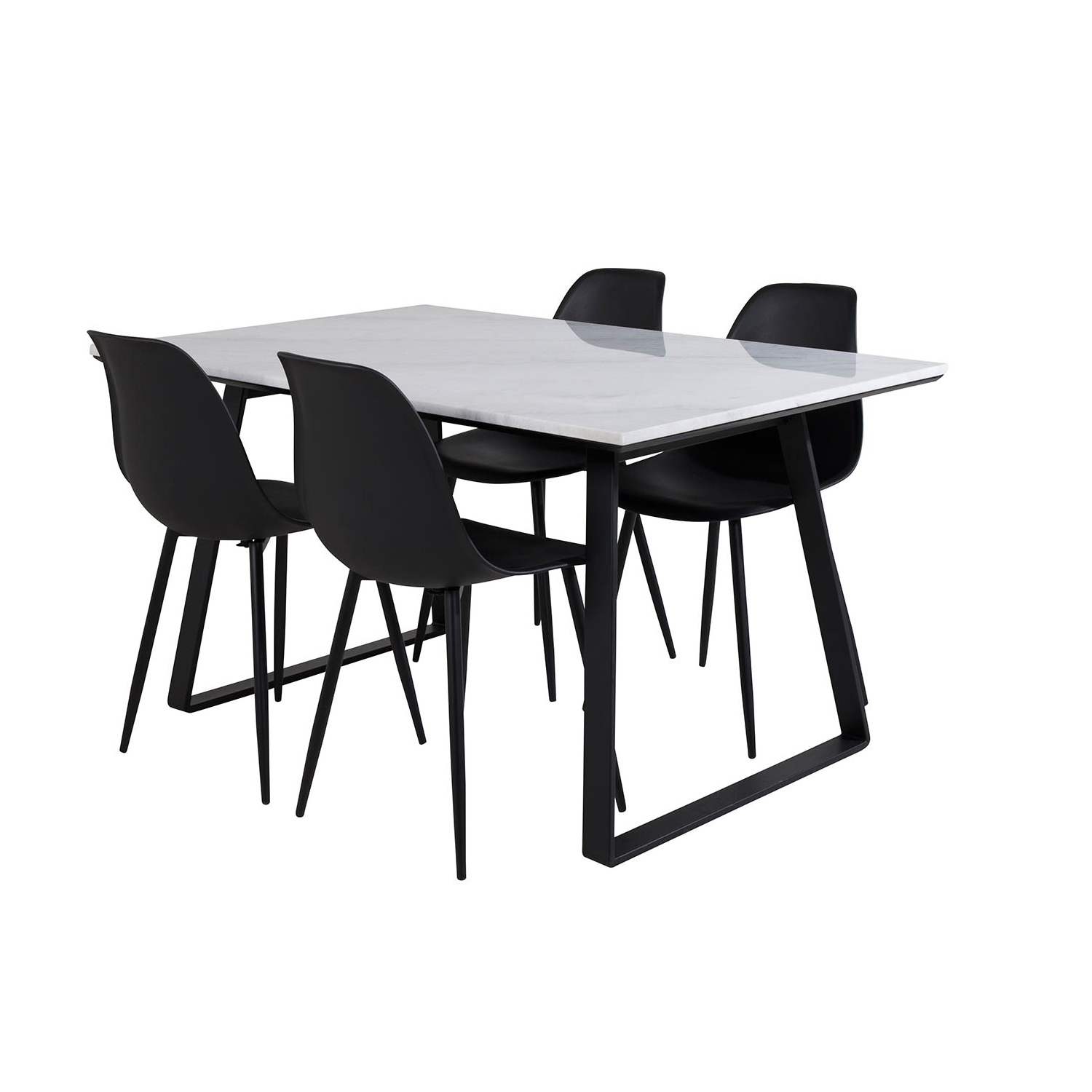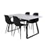 Matgrupp Venture Home Estelle 140 med 4 Pop Stolar är en modern matgrupp med ett rektangulärt matbord i modern design med underrede i svart pulverlackerad metall med en bordsskiva i marmor. Det medföljer fyra matstolar i modern design med ben i svart pulverlackerad metall. Skålformad rundad rygg och sits i helgjuten plast. Lättare montering krävs.