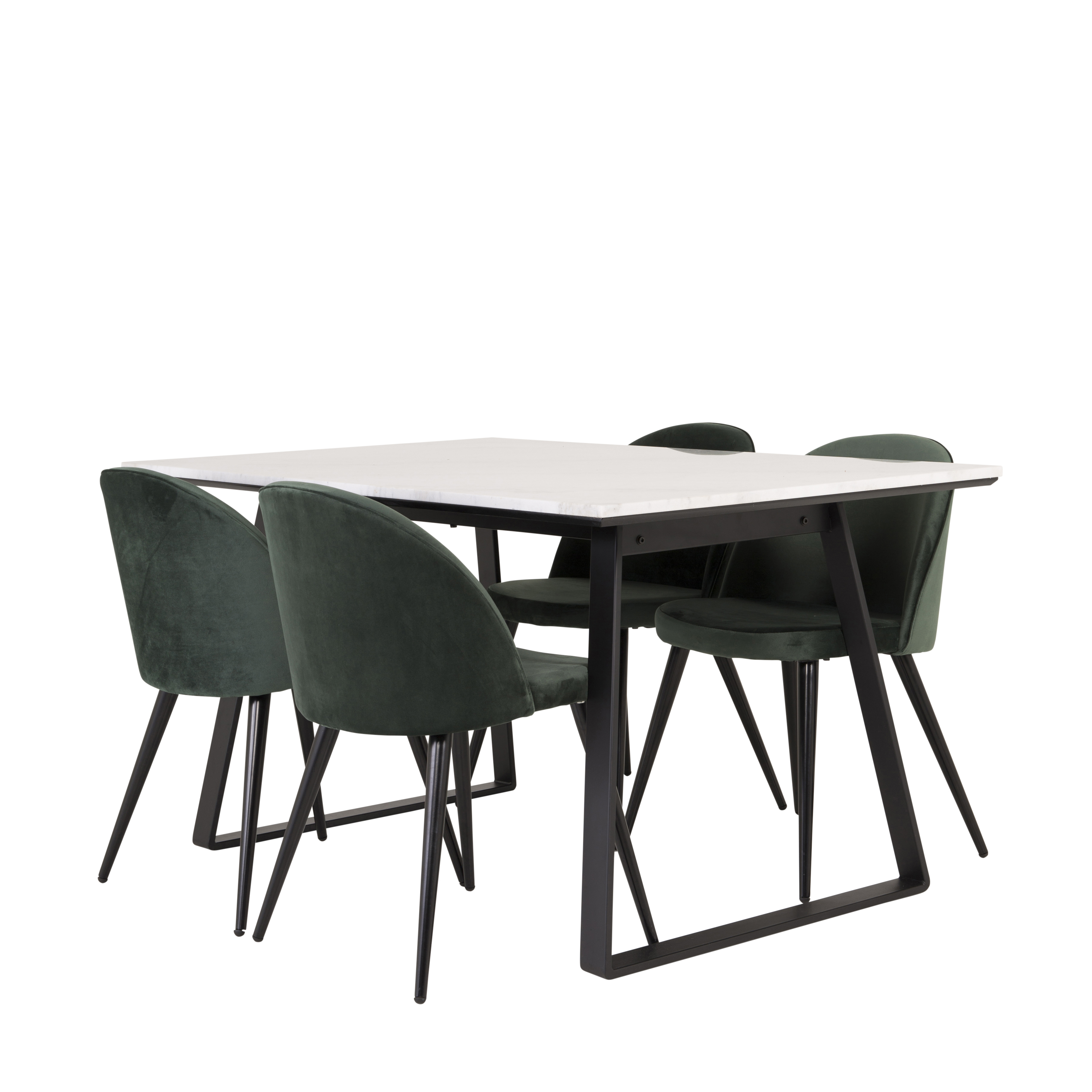 Matgrupp Venture Home Estelle med Valentina stolar är en elegant matgrupp med ett vitt marmorbord och fyra stycken stolar i sammet.