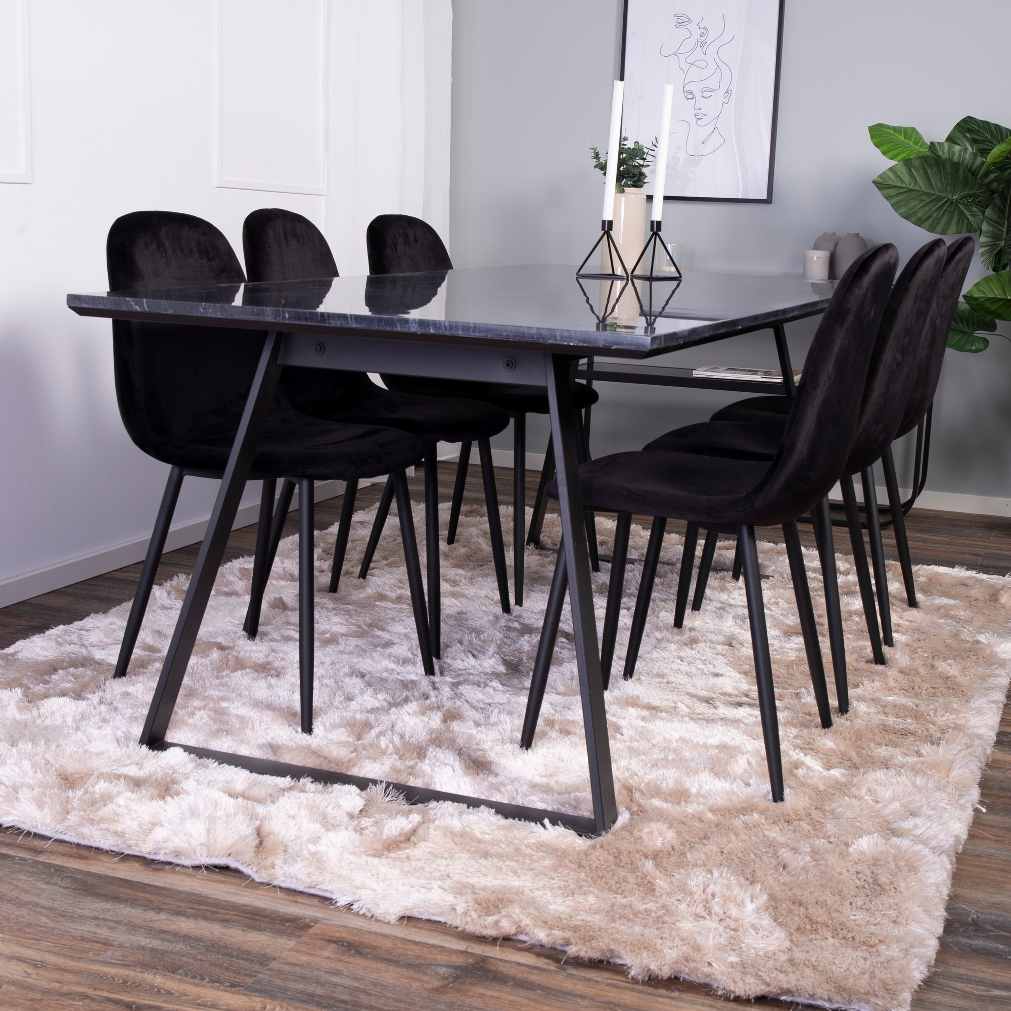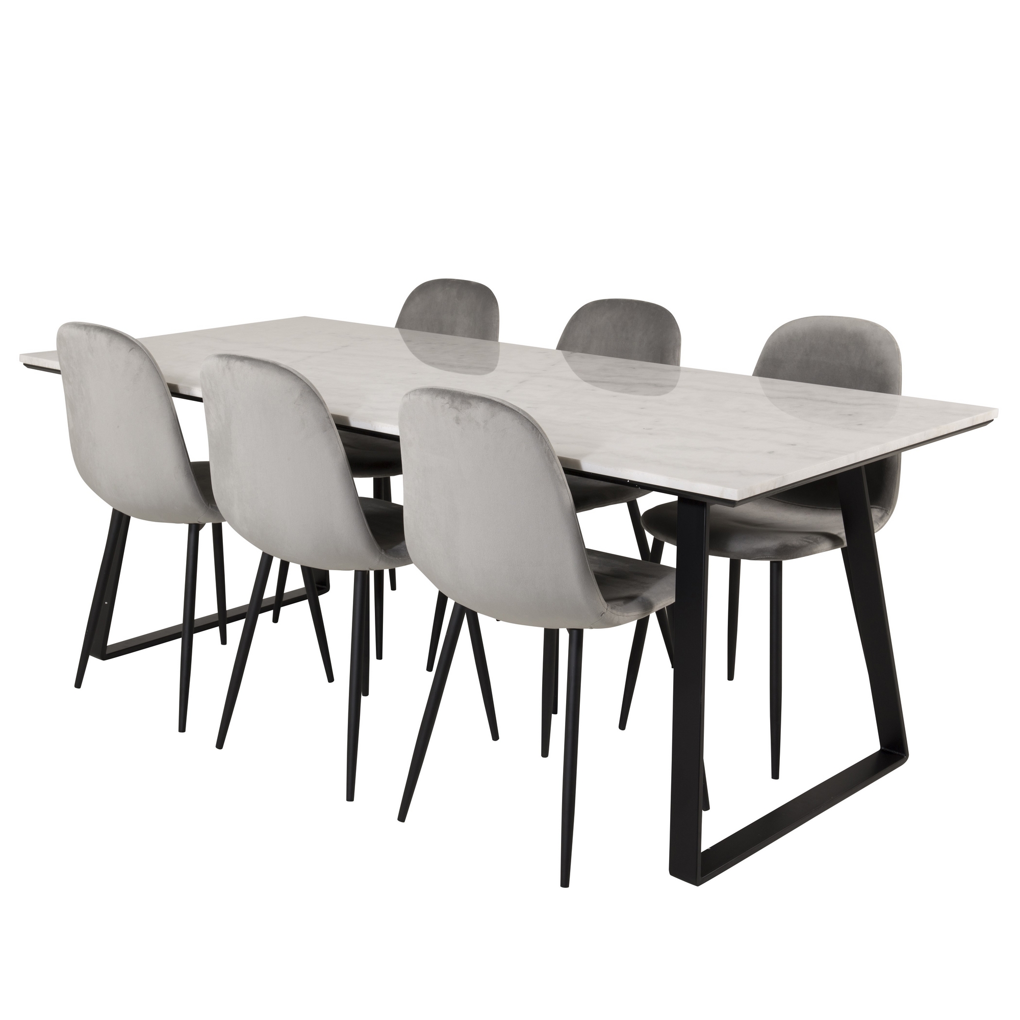 Matgrupp Venture Home Estelle 200 med 6 Pobbie Stolar Sammet är en modern matgrupp med ett rektangulärt bord och sex bekväma stolar. Matbordet har en stomme och ben i metall samt en bordsskiva i mörk marmor. Matstolarna har en stomme och ben i metall med en rundad rygg och sits. Rygg och sits är klädda i sammet. Lättare montering krävs.