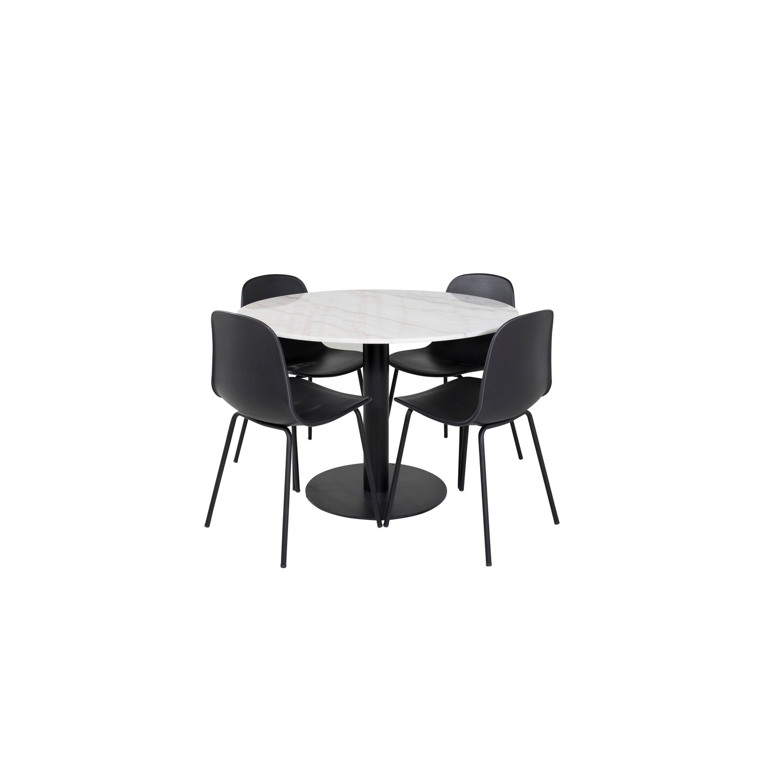 Matgrupp Venture Home Estelle med 4 Ardi Stolar är en elegant matgrupp med ett runt matbord i modern design med trumpetfot i svart pulverlackerad metall med en bordsskiva i marmor. Det medföljer fyra matstolar med ben i svart pulverlackerad metall. Stolarna har en lätt rundad rygg och sits i helgjuten plast. Lättare montering krävs.