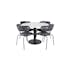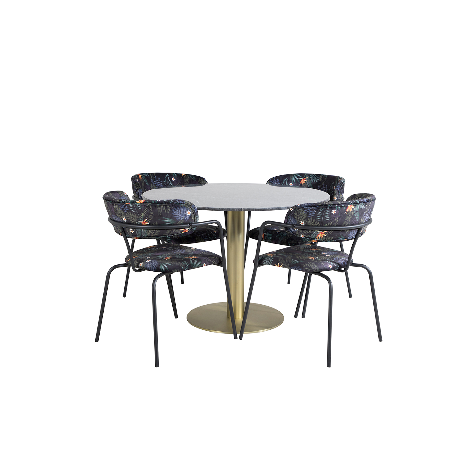 Matgrupp Venture Home Estelle med 4 Aris Stolar PolyEstelletyg är en elegant matgrupp med ett runt matbord i modern design med trumpetfot i pulverlackerad metall med en bordsskiva i marmor. Det medföljer fyra karmstolar med stomme, ben samt integrerade armstöd i svart pulverlackerad metall. Stolarna har en rundad rygg och sits i stoppat, svart, blommönstrat polyEstelletyg. Lättare montering krävs.