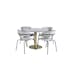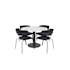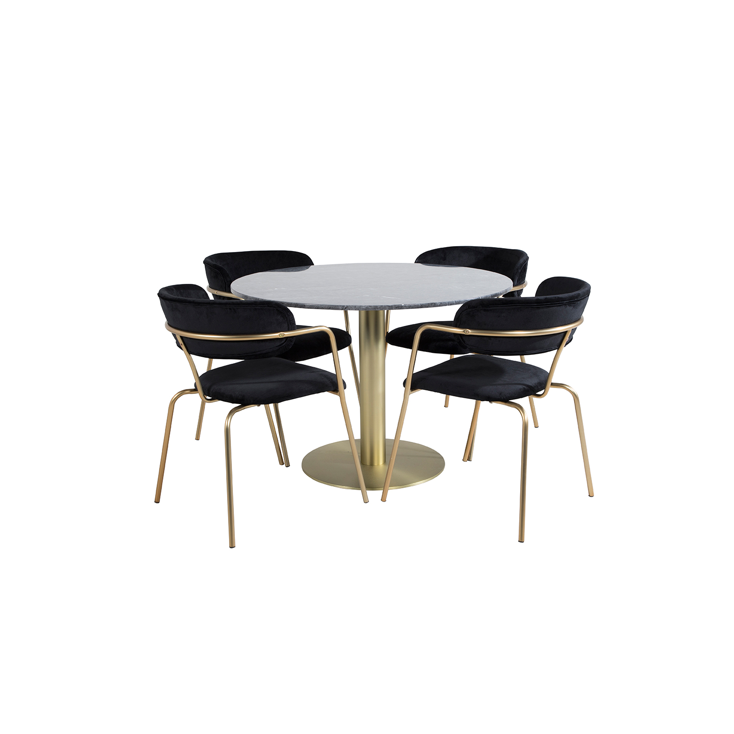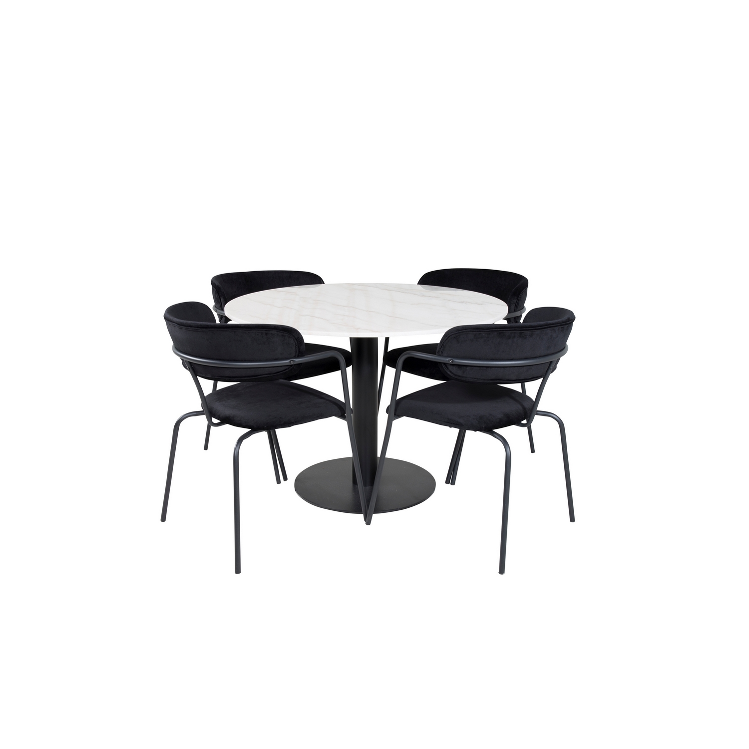 Matgrupp Venture Home Estelle med 4 Aris Stolar Sammet är en elegant matgrupp med ett runt matbord i modern design med trumpetfot i pulverlackerad metall med en bordsskiva i marmor. Det medföljer fyra karmstolar med stomme, ben samt integrerade armstöd i svart pulverlackerad metall. Stolarna har en rundad rygg och sits i stoppat sammetstyg. Lättare montering krävs.