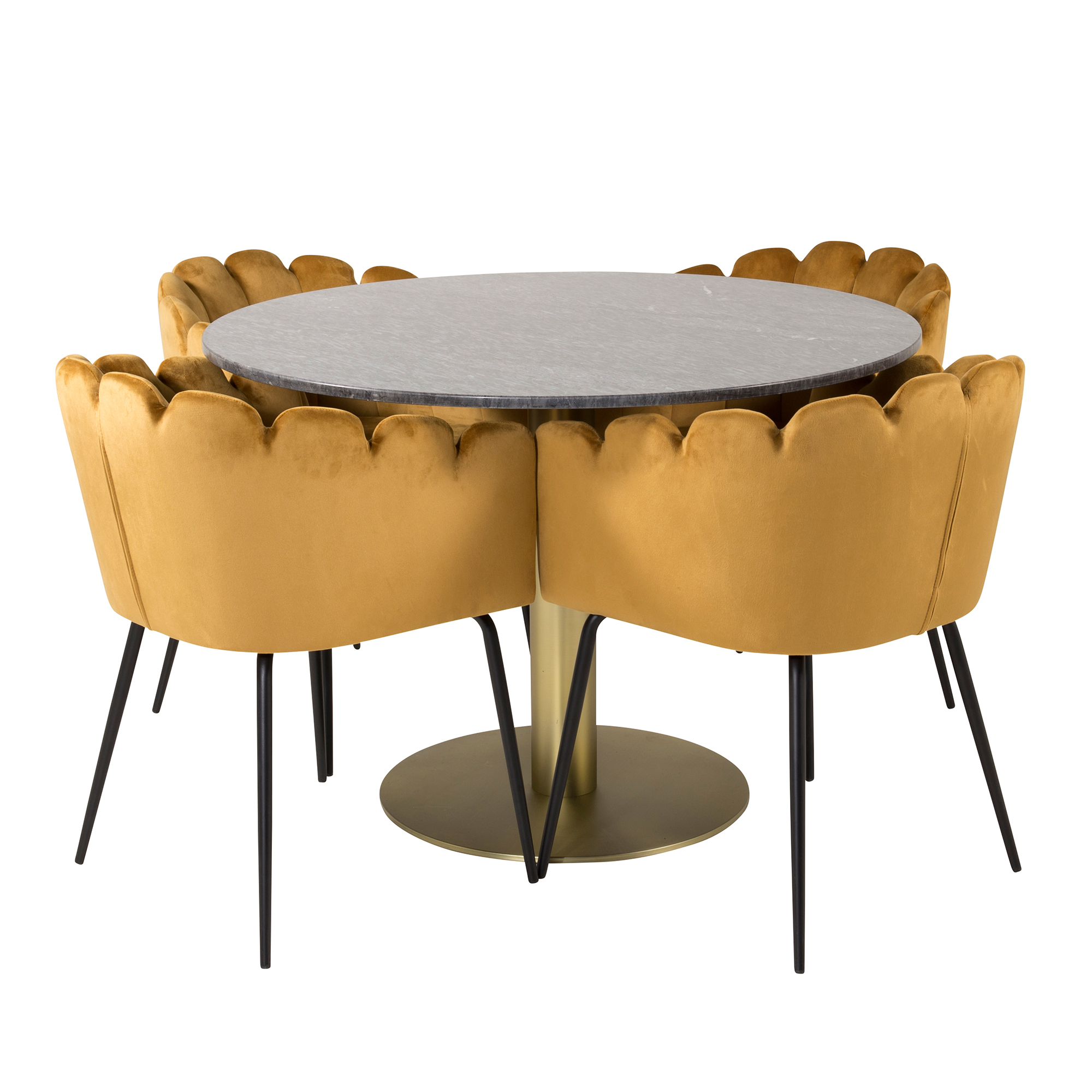 Matgrupp från Furniture Fashion. Runt matbord Estelle med fot och rund centrumpelare. Bordsskiva i marmor. Matstolar Limhamn med stomme och ben i svart metall. Låg rygg i en exklusivt utformad design. Ryggen och sitsen är i sammet. Lättare montering krävs.