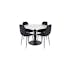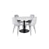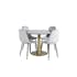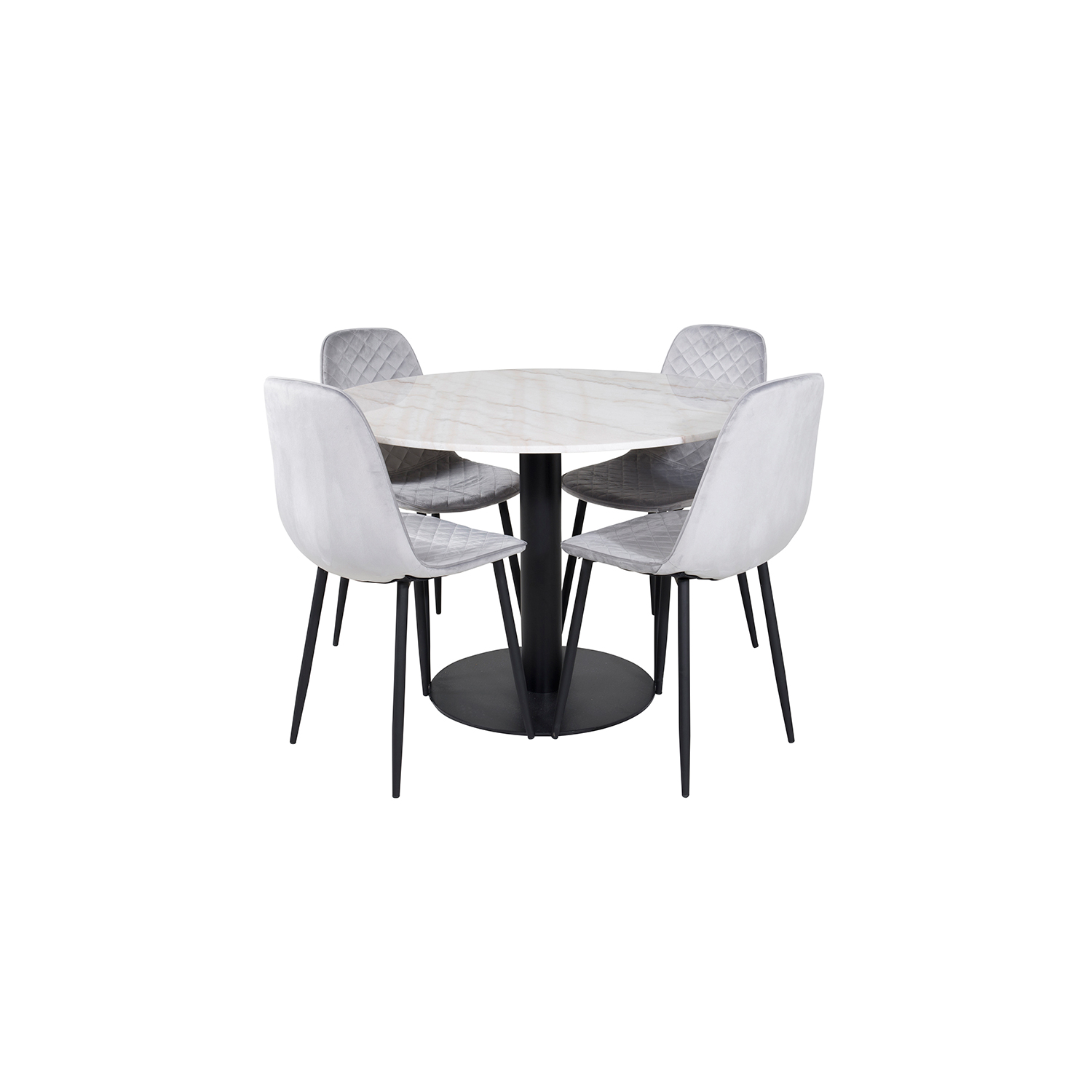 Matgrupp Venture Home Estelle med 4 Phoi Stolar Sammet är en elegant matgrupp med ett runt matbord i modern design med trumpetfot i pulverlackerad metall med en bordsskiva i marmor. Det medföljer fyra matstolar i en helklädd design med ben i pulverlackerad metall. Stolarna har en lätt rundad rygg och sits i stoppat sammetstyg med dekorsömmar på insidan av rygg och sits som bildar ett rutmönster. Lättare montering krävs.