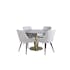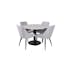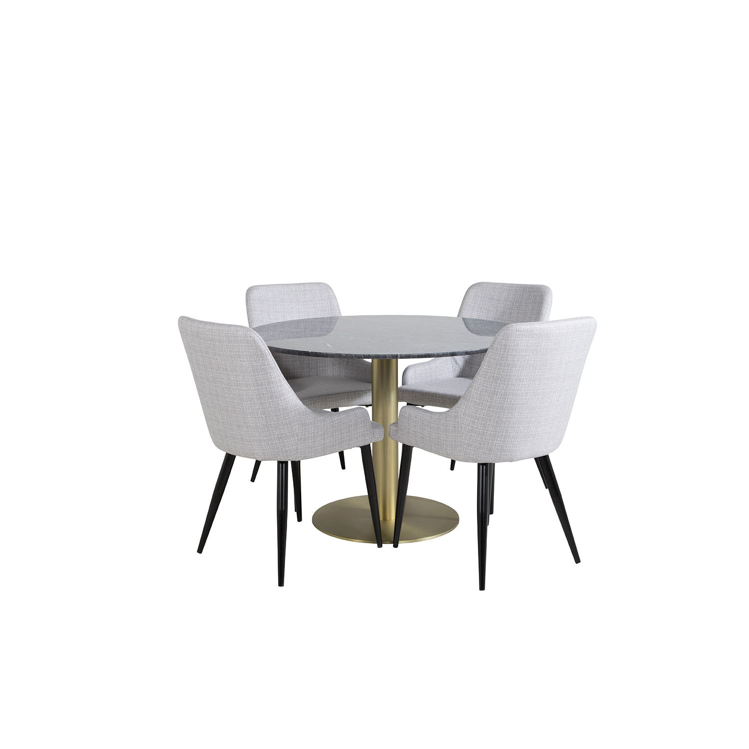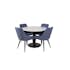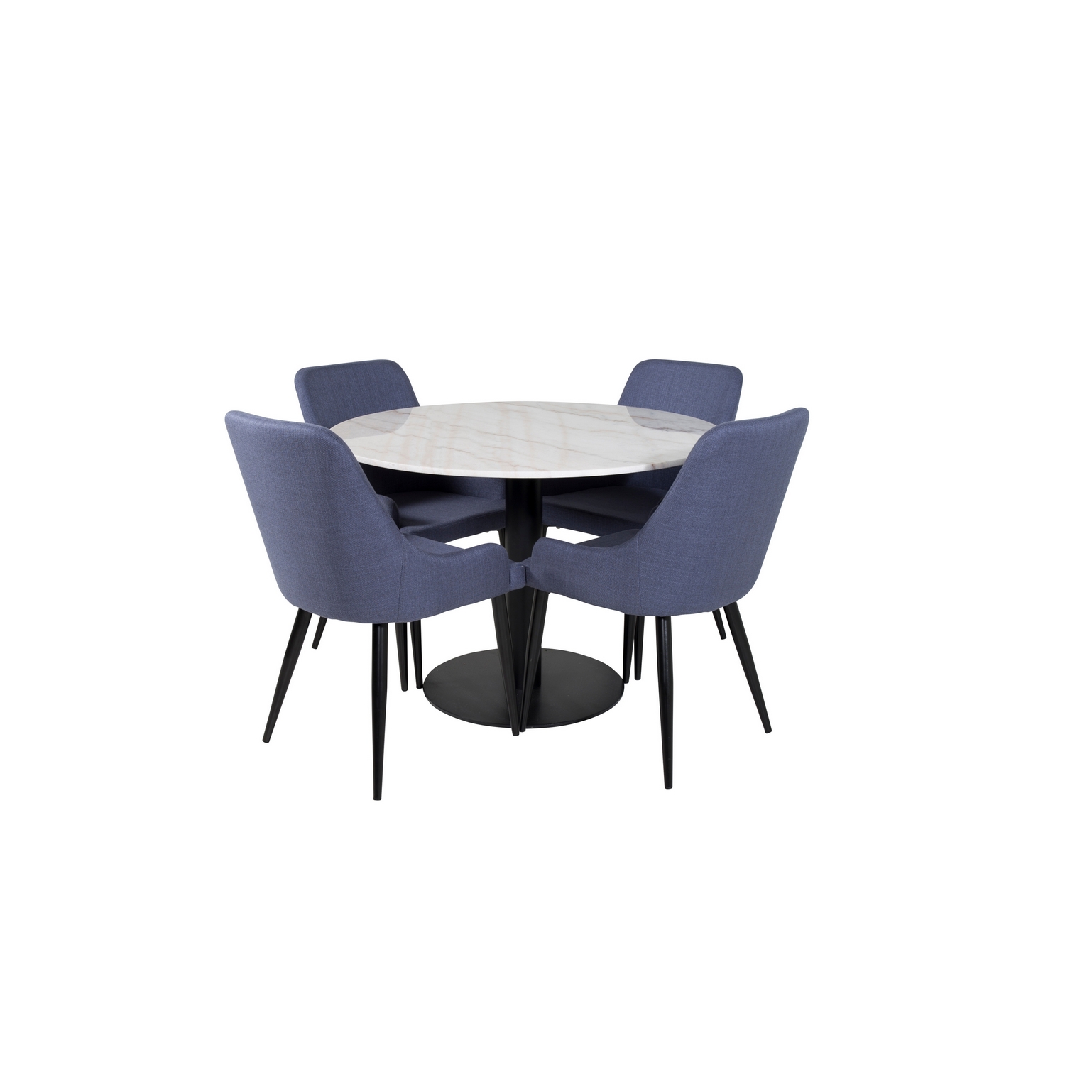 Matgrupp Venture Home Estelle med 4 Plake Fåtöljer PolyEstelletyg är en elegant matgrupp med ett runt matbord i modern design med trumpetfot i pulverlackerad metall med en bordsskiva i marmor. Det medföljer fyra fåtöljer/matstolar i en helklädd design med ben i pulverlackerad metall. Stolarna har en rygg och sits i polyEstelletyg med mjuk stoppning. Lättare montering krävs.