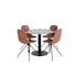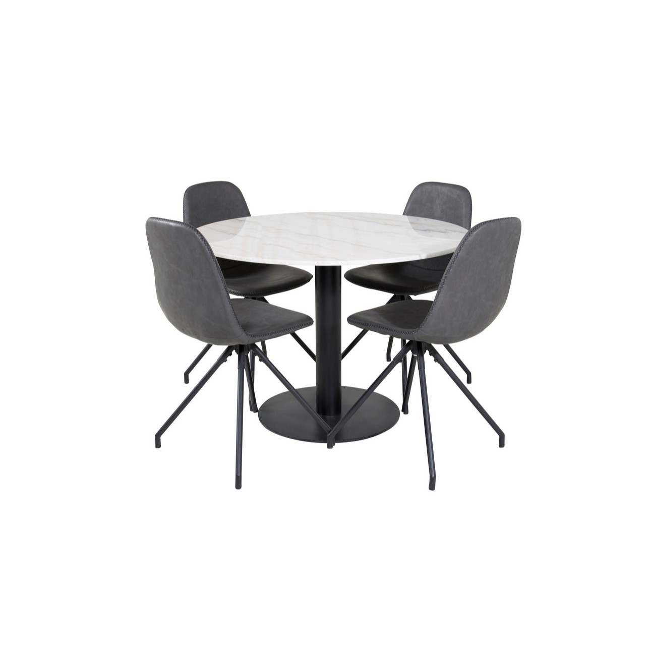 Matgrupp Venture Home Estelle med 4 Pobbie Stolar Konstläder är en stilren matgrupp med ett runt matbord i modern design med trumpetfot i pulverlackerad metall med en bordsskiva i marmor. Det medföljer fyra matstolar i en helklädd design med snurrfunktion, stomme och ben i svart pulverlackerad metall med en lätt rundad rygg och sits i stoppat konstläder med dekorsöm. Lättare montering krävs.