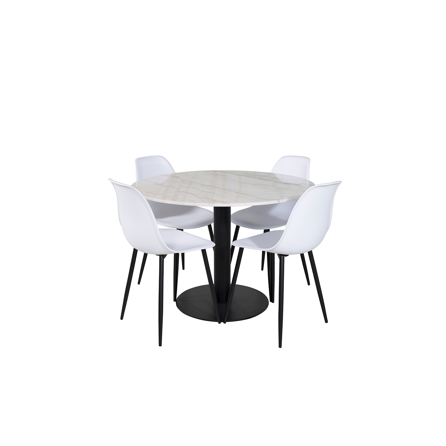 Matgrupp Venture Home Estelle med 4 Pop Stolar är en stilren matgrupp med ett runt matbord i modern design med trumpetfot i pulverlackerad metall med en bordsskiva i marmor. Det medföljer fyra matstolar i modern design med ben i pulverlackerad metall. Stolarna har en skålformad, rundad rygg och sits i helgjuten plast. Lättare montering krävs.