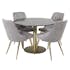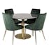 Matgrupp Estelle från Venture Home med ett runt matbord i svart marmor med mässingsfärgade bordsben i metall. Matchas med 4 st Vera matstolar med stolsits i sammet och stolsben i metall.