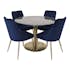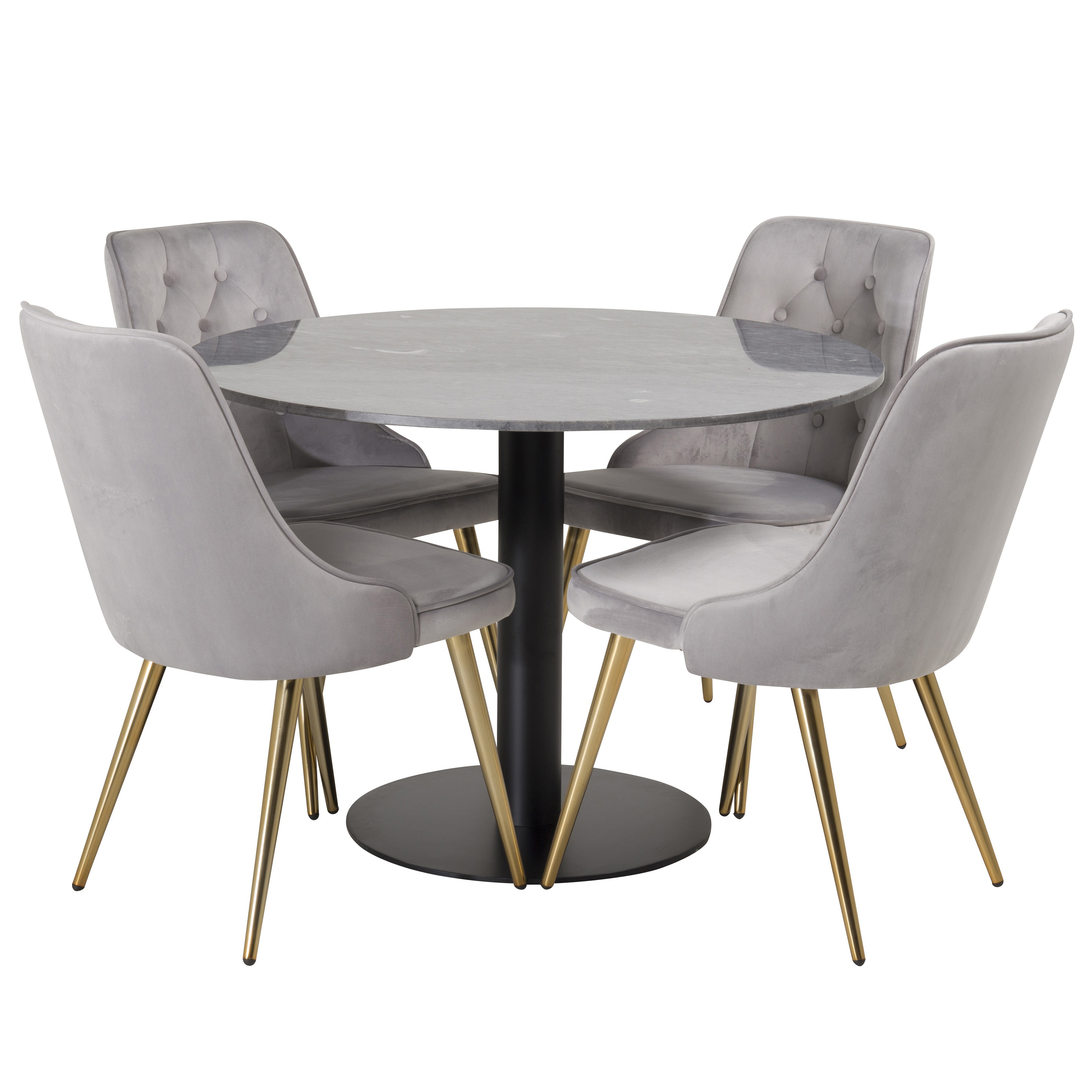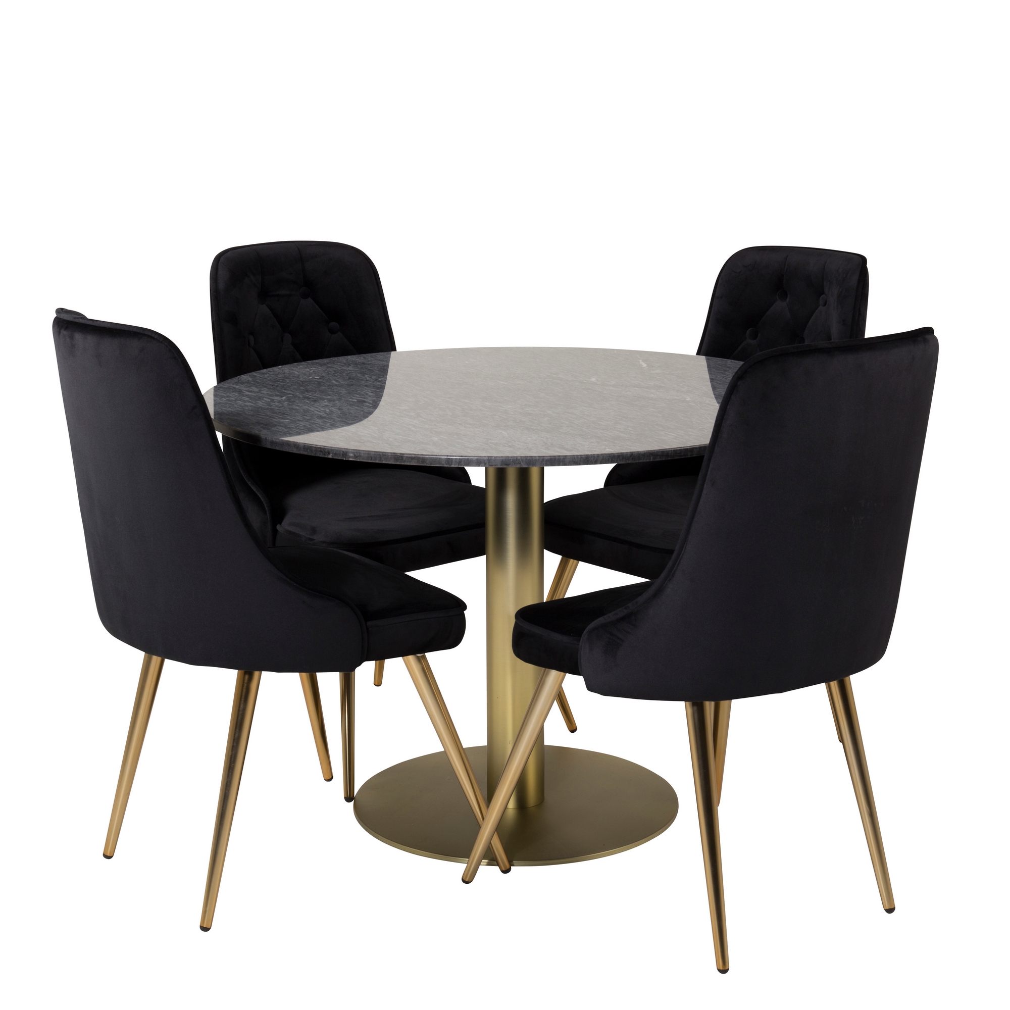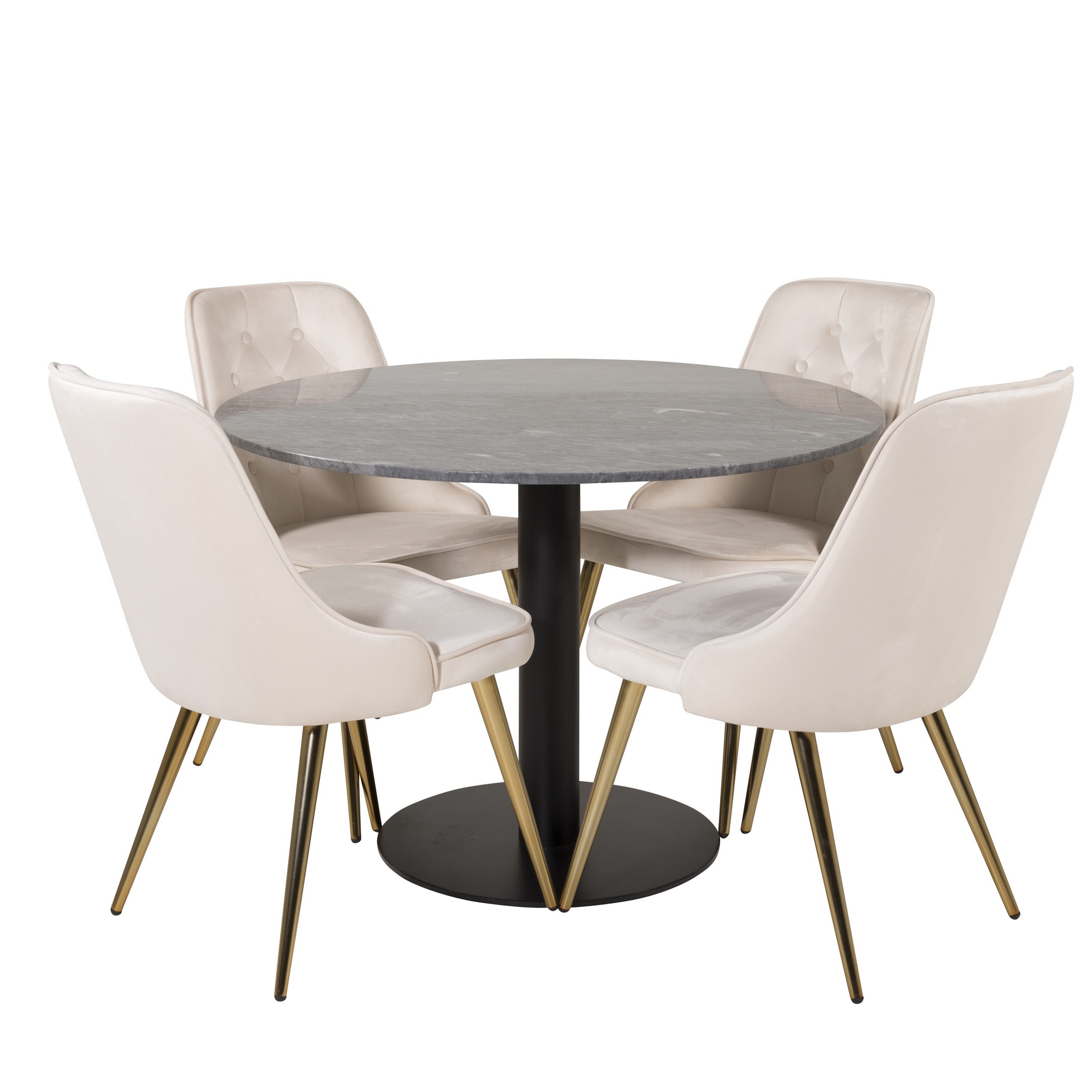 Matgrupp Venture Home Estelle Rund med 4 Vera Stolar Sammet är en elegant matgrupp med ett marmorbord och fyra stolar i sammet.