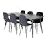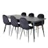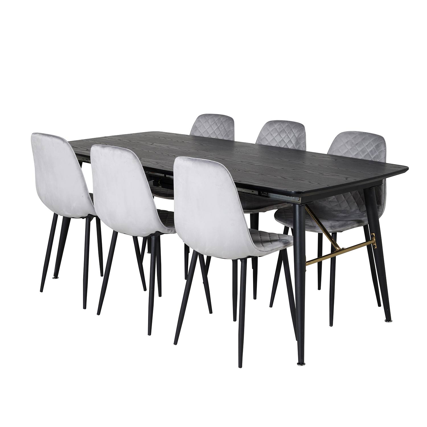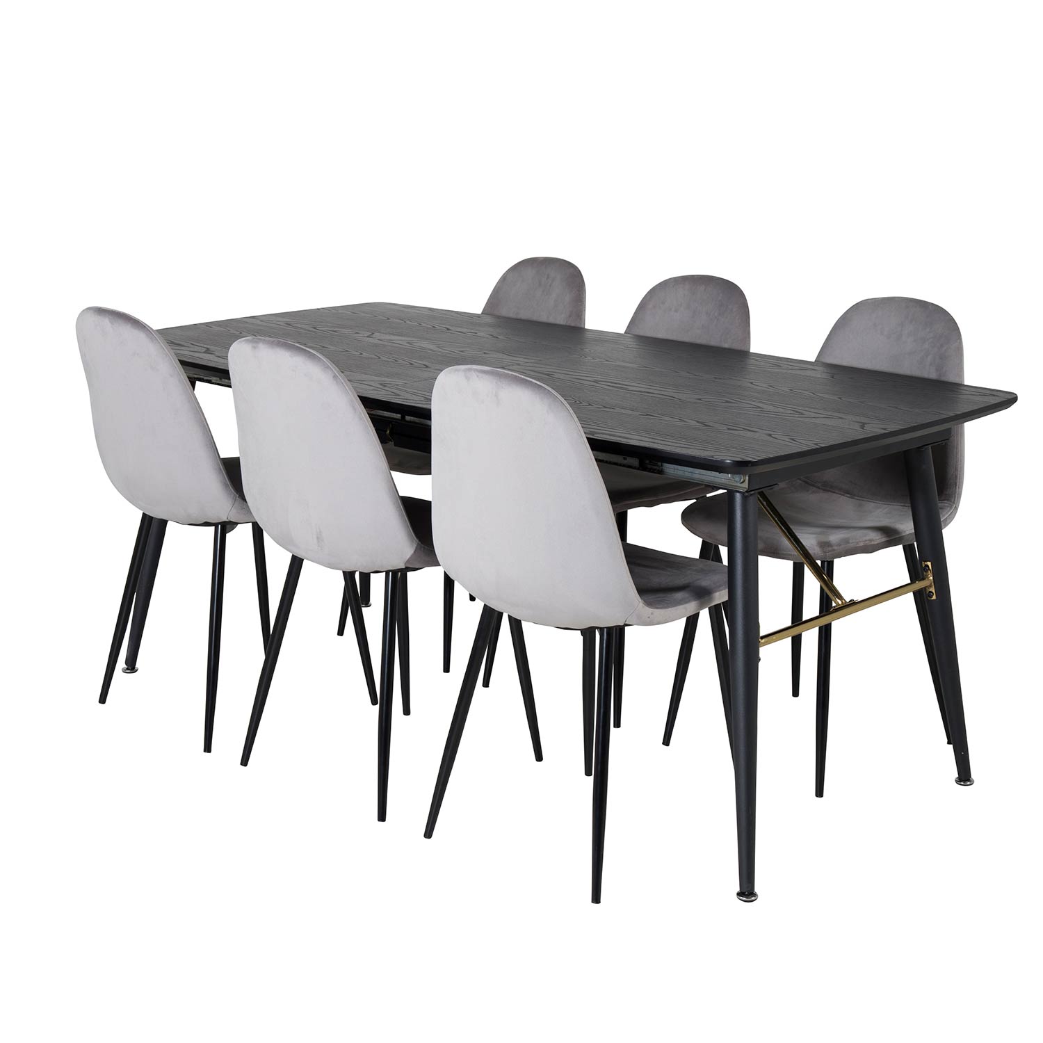 Matgrupp Venture Home Dipp med 6 Polar Stolar Sammet är en elegant matgrupp med ett förlängningsbart matbord i svart MDF och svarta bordsben i metall. Det medföljer sex matstolar med stolsben i metall och sitsar i sammet.