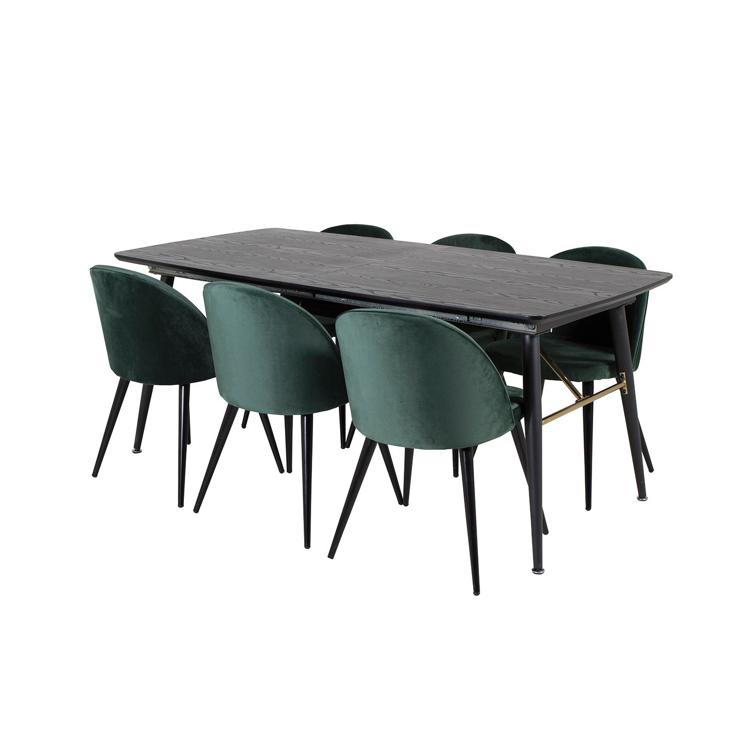 Matgrupp Venture Home Guld med 6 Velvet Stolar Sammet är en elegant matgrupp med ett förlängningsbart matbord i svart MDF och svarta bordsben i metall. Det medföljer sex matstolar med svarta stolsben i metall och sitsar i sammet.