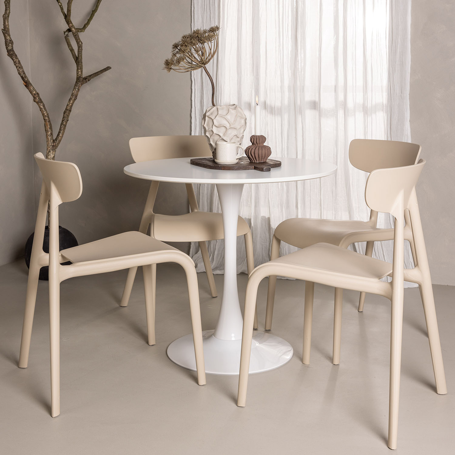 Venture Designs matgrupp med det eleganta bordet Hamden är den perfekta kombinationen av stil och funktionalitet. Med en höjd på 75 cm och en bordsskiva med en diameter på 80 cm erbjuder Hamden-bordet en generös yta för dina måltider., Den rena vita färgen ger en känsla av ljus och rymd i rummet, samtidigt som det skapar en modern och fräsch atmosfär.