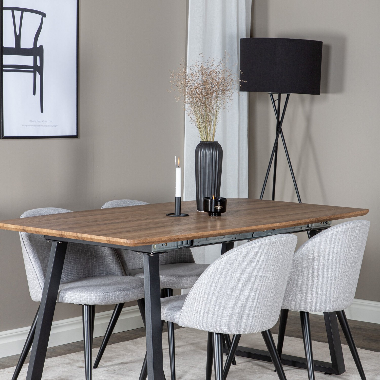 Matgrupp Venture Home Ina med 4 Valentina Stolar Polyestertyg är en stilren matgrupp med ett förlängningsbart matbord i MDF med bordsben i metall. Det medföljer fyra matstolar med stolsben i metall och sitsar i polyester.