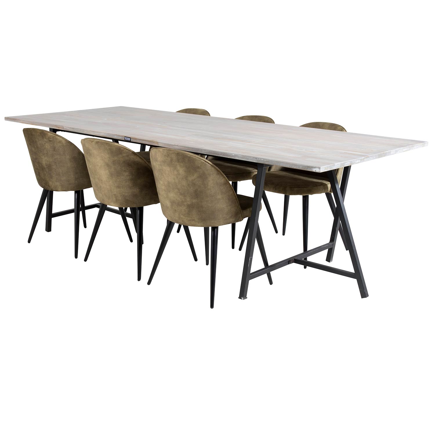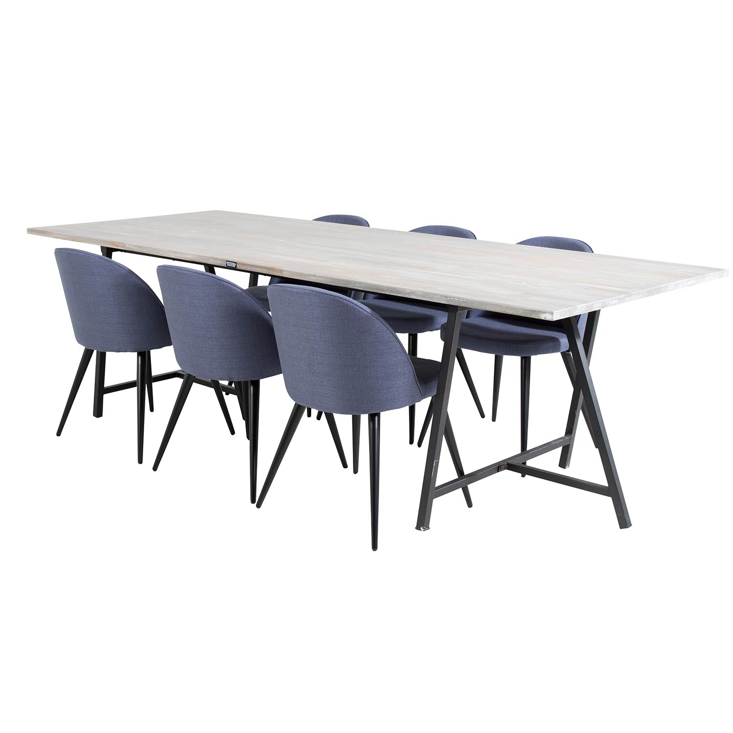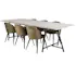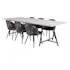 Matgrupp Venture Home Jenni med 6 Valentina Stolar är en matgrupp med ett rektangulärt matbord i modern design med en stomme och ben i svart pulverlackerad metall med en bordsskiva i grå teak. Det medföljer sex matstolar med en helklädd design, ben i svart pulverlackerad metall samt rundad rygg och sits i polyestertyg. Rygg och sits har mjuk stoppning. Lättare montering krävs.