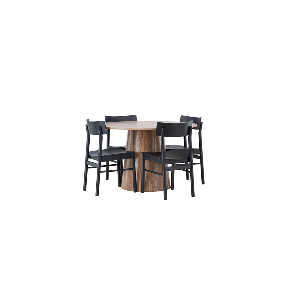 Den Skandinaviska designen när den är som bäst! Vårt underbara, runda matbord Lanzo har en genomgående helhetsdesign i brun MDF med en tunn toppskiva och en vriden cylinderformad stomme som är centrerad under bordets mitt. Här i smakfull kombination med moderna matstolar från serien Montros. Stolen har en klassisk och nostalgisk design med raka nordiska former, genomgående tillverkad i gummiträ. En perfekt match helt enkelt!