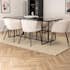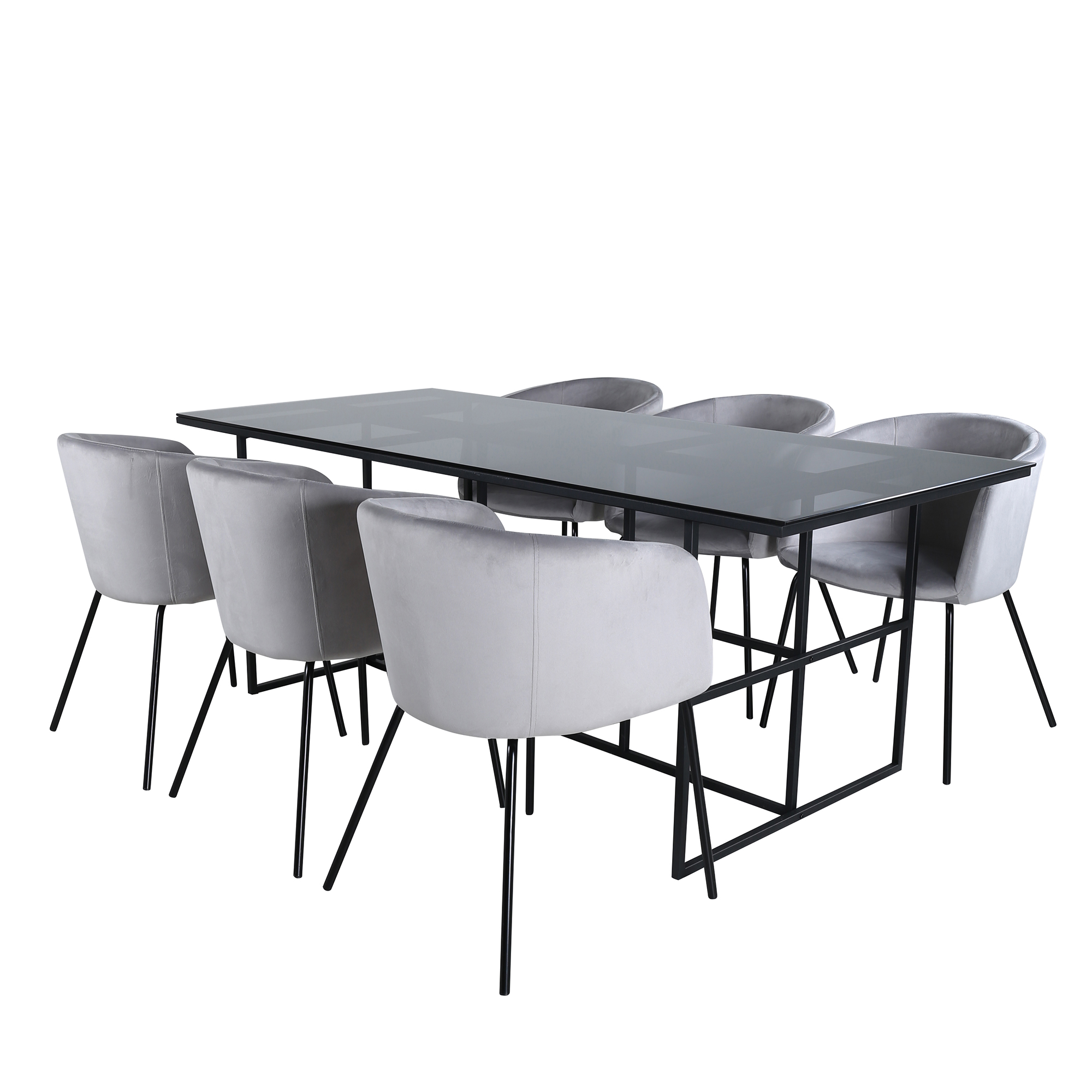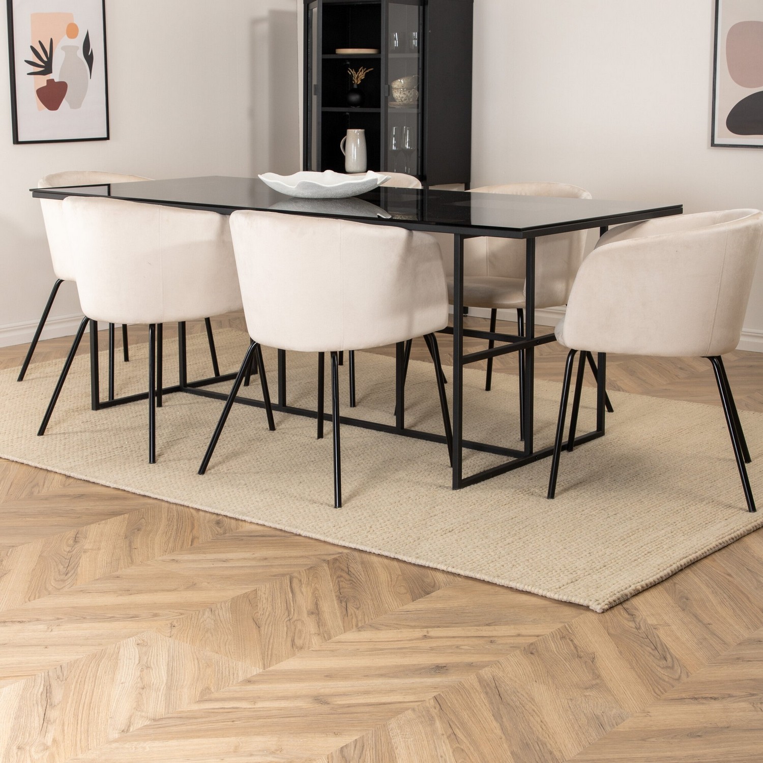 Matgrupp Lund från Venture Home. Med ett matbord i svart glas med svarta bordsben i metall tub. Matchas med 6 st Bergen matstolar med svarta stolsben i järn och sitsar i sammet.