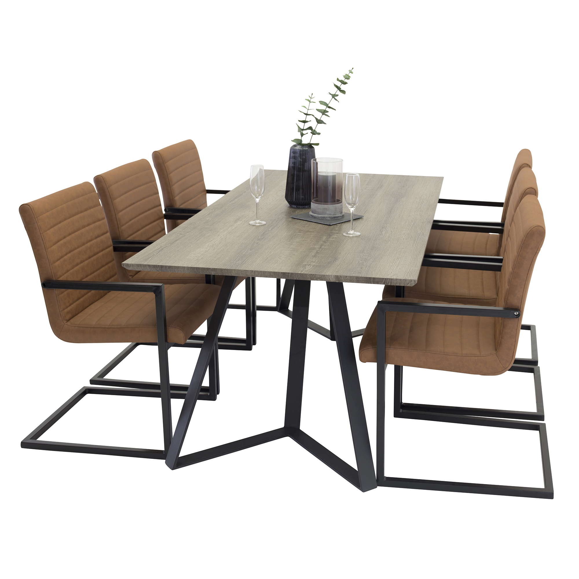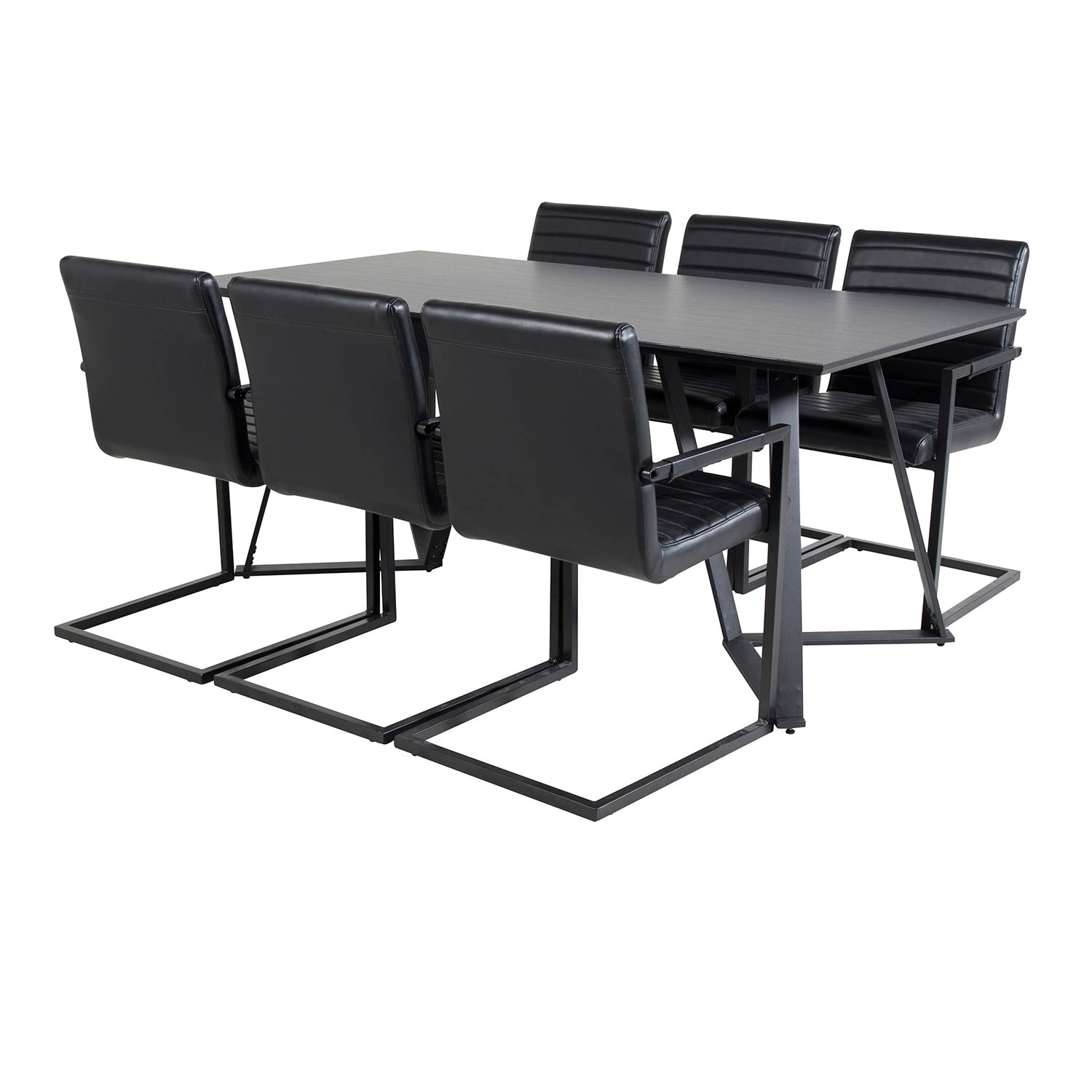 Matgrupp Madde från Venture Home. Matbord i grå MDF med svarta bordsben i metall. Matchas med 6 st Asta matstolar med stolsits i konstläder och svarta stolsben i metall.