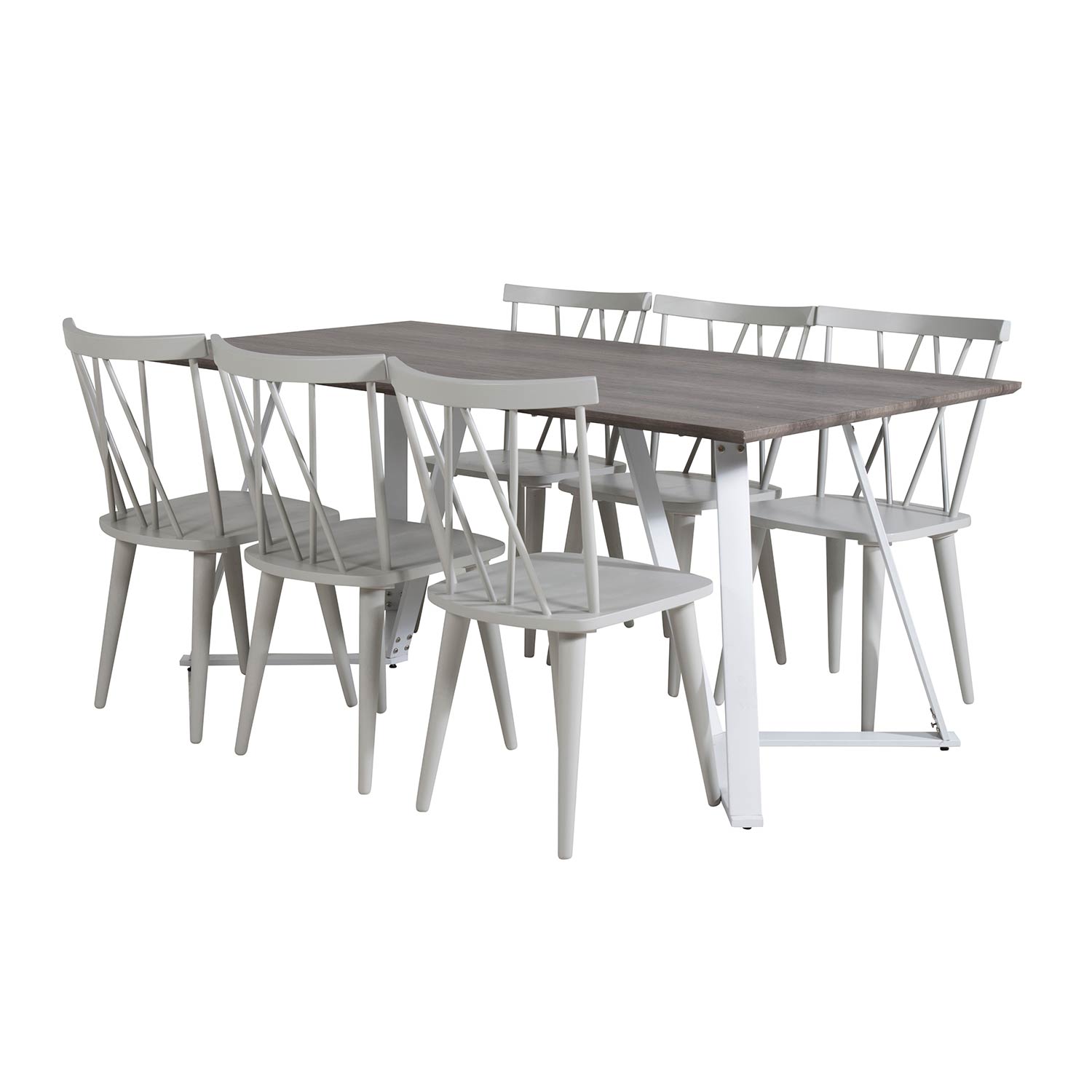 Matgrupp Venture Home Madde med 6 Marie Stolar är en elegant matgrupp med ett matbord i grå MDF med vita bordsben i metall. Det medföljer sex matstolar med stolsben i metall och sitsar i gummiträ.