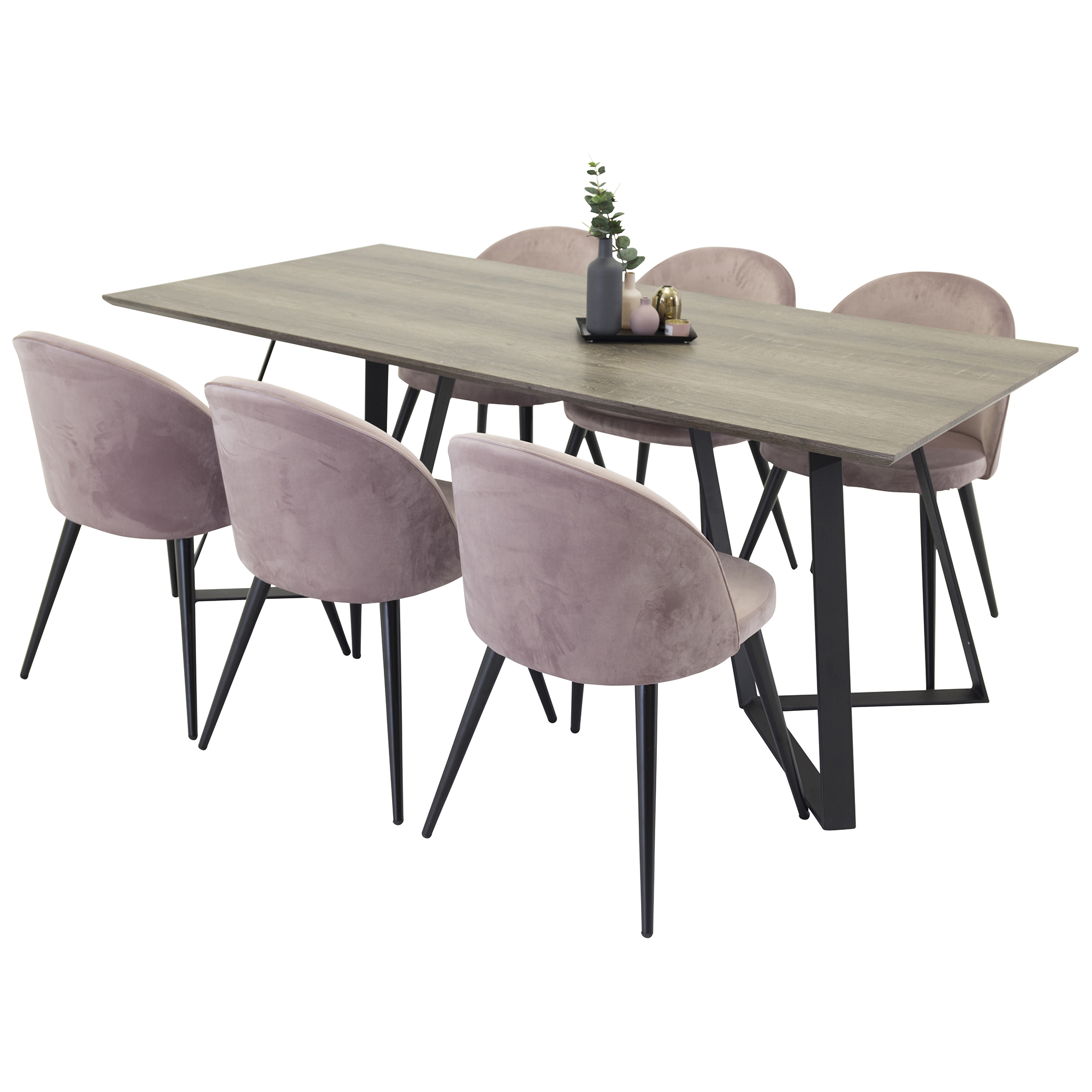 Matgrupp Madde från Venture Home. Matbord i grå MDF med svarta bordsben i metall. Matchas med 6 st Valentina matstolar med stolsits i sammet och svarta stolsben i metall.