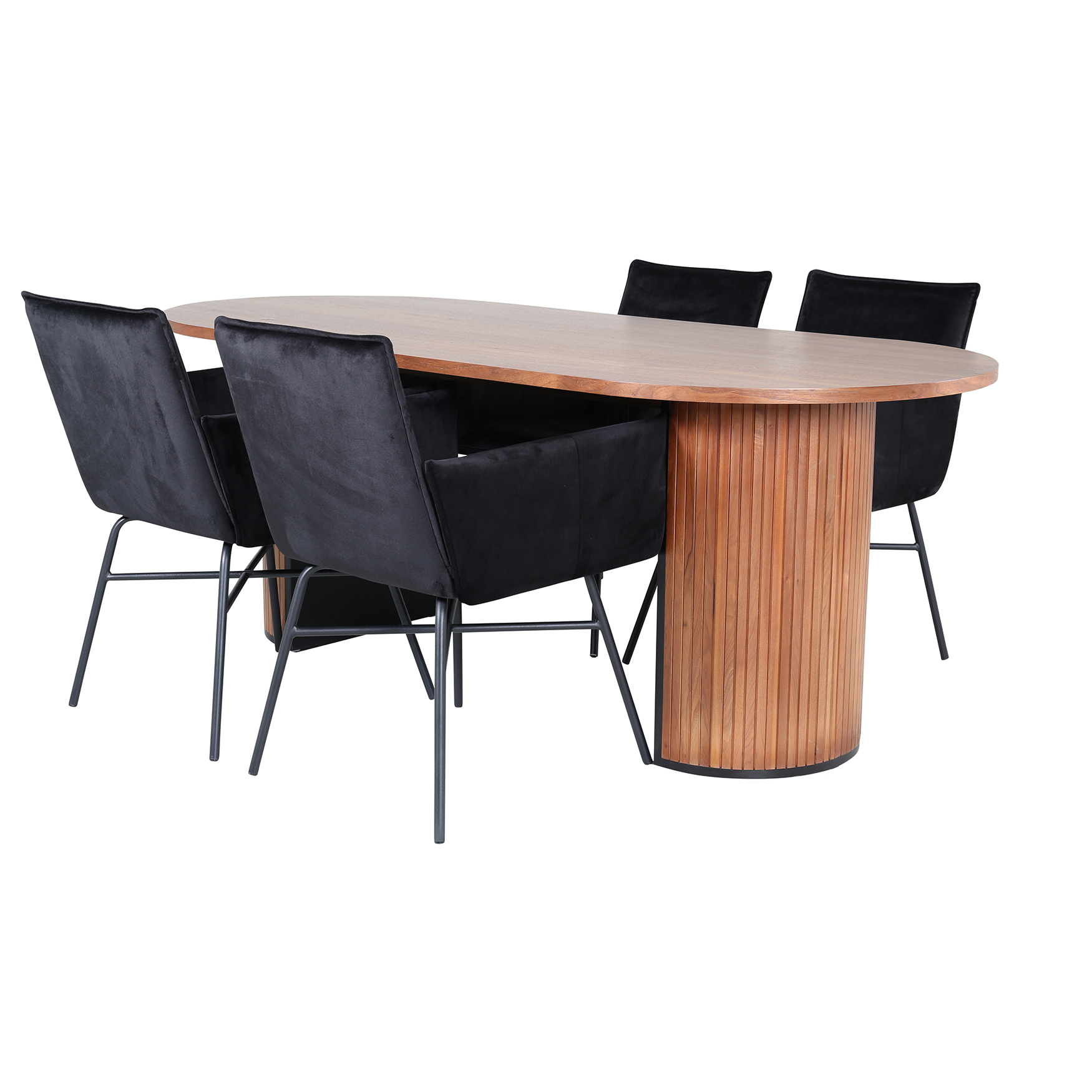 Matgrupp Bianca, med ett ovalt matbord i MDF med faner med samt svarta i trä och MDF. Matchas med 4 st Annika matstolar med sitsar i sammet.