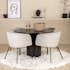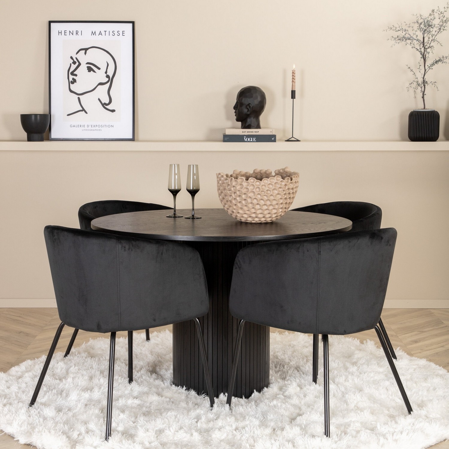 Matgrupp Bianca, med ett runt matbord i MDF med faner med bordsben i trä och MDF. Matchas med 4 st Bergen matstolar med sitsar i sammet.