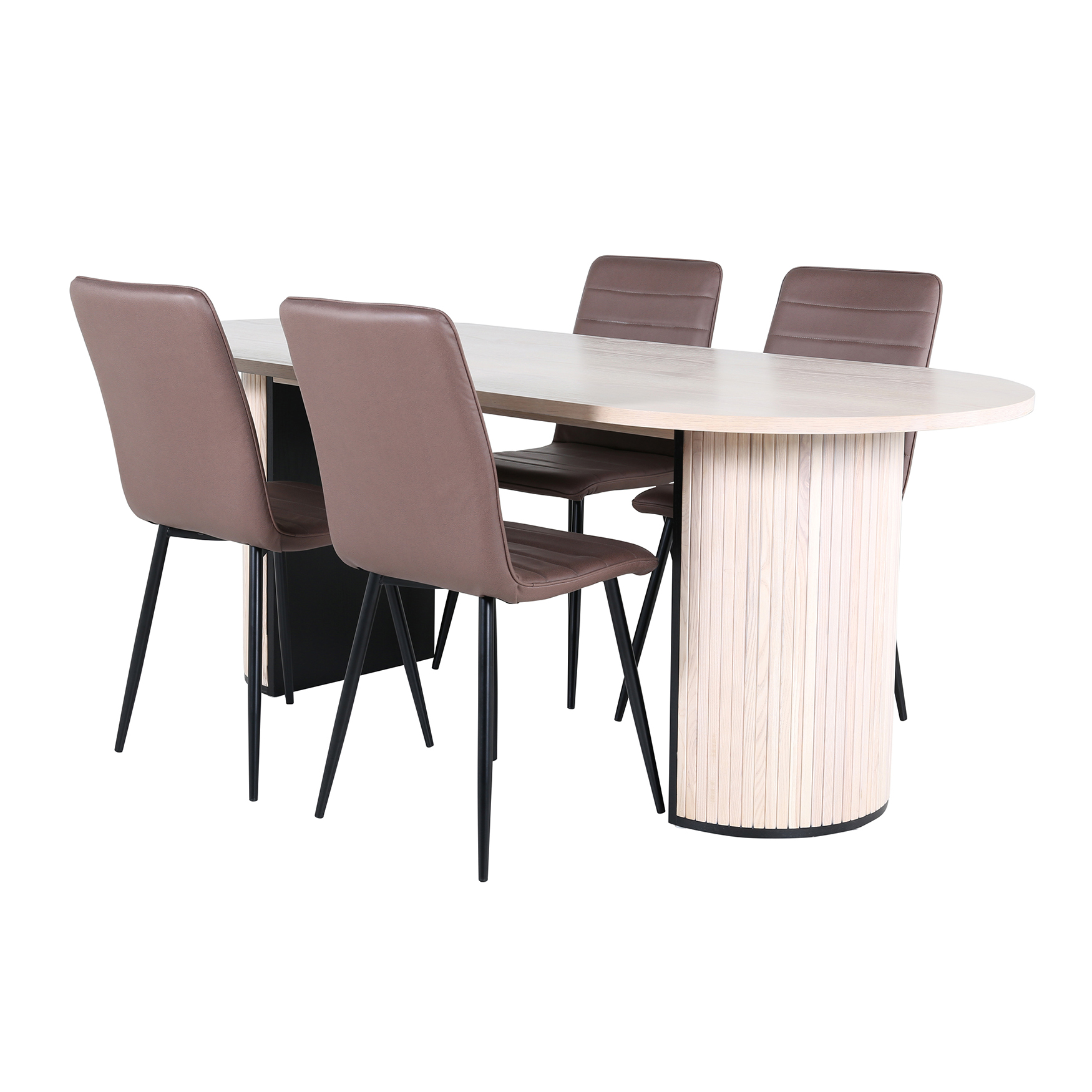 Matgrupp Bianca, med ett ovalt matbord i MDF med faner med bordsben i trä och MDF. Matchas med 4 st Walerina matstolar med sitsar i mikrofiber.